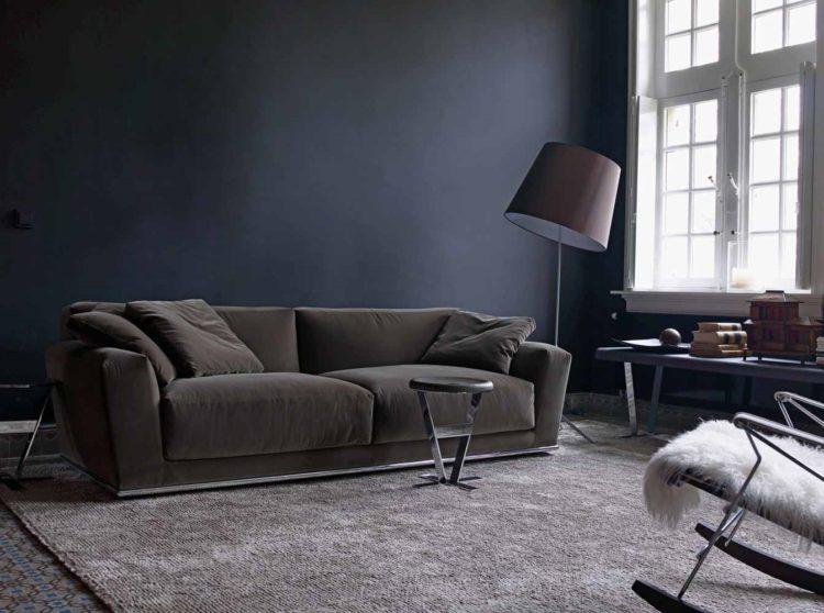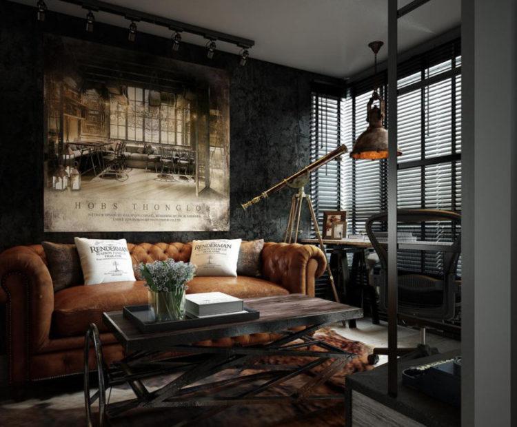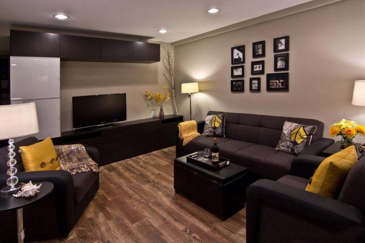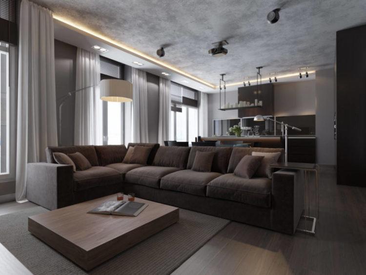 Una habitación hecha en colores oscuros se verá bastante bien. Pero no lo haga muy sombrío, es mejor vencer a la sala de estar con grandes ventanas o elementos brillantes de decoración.