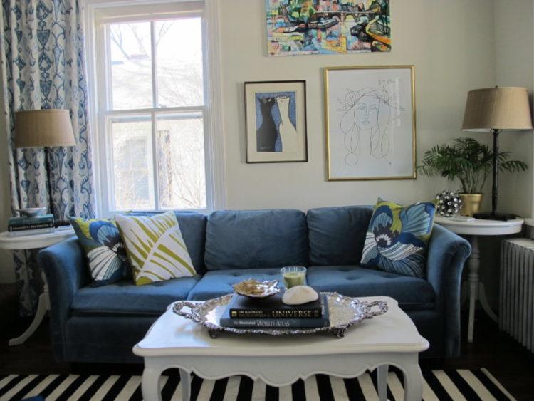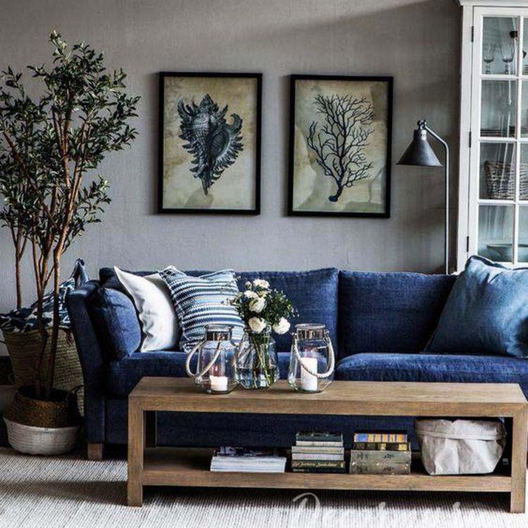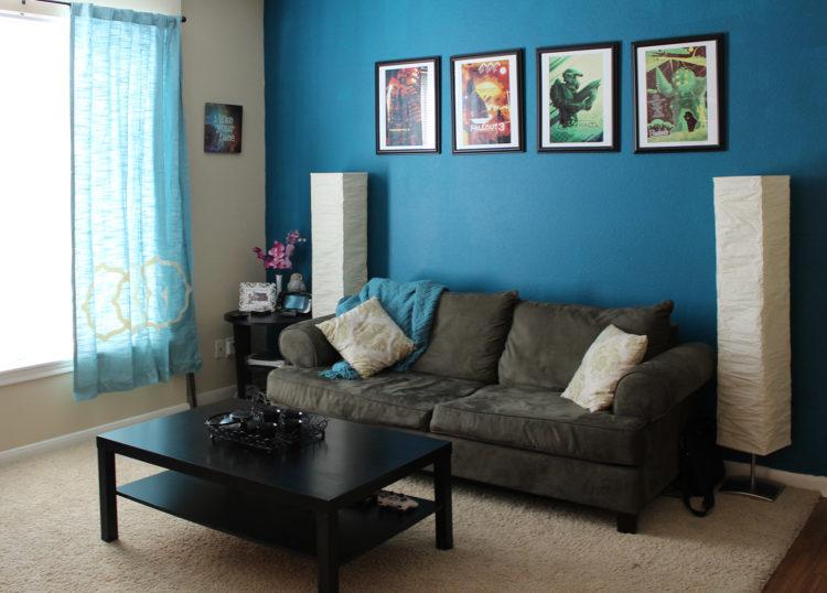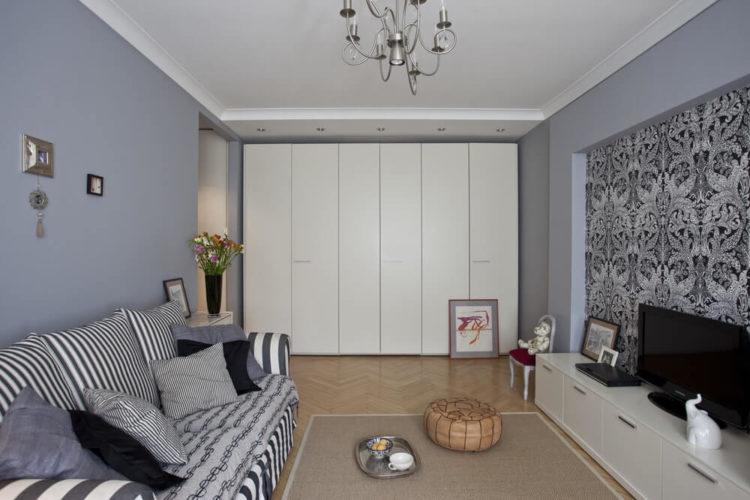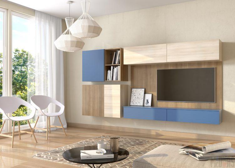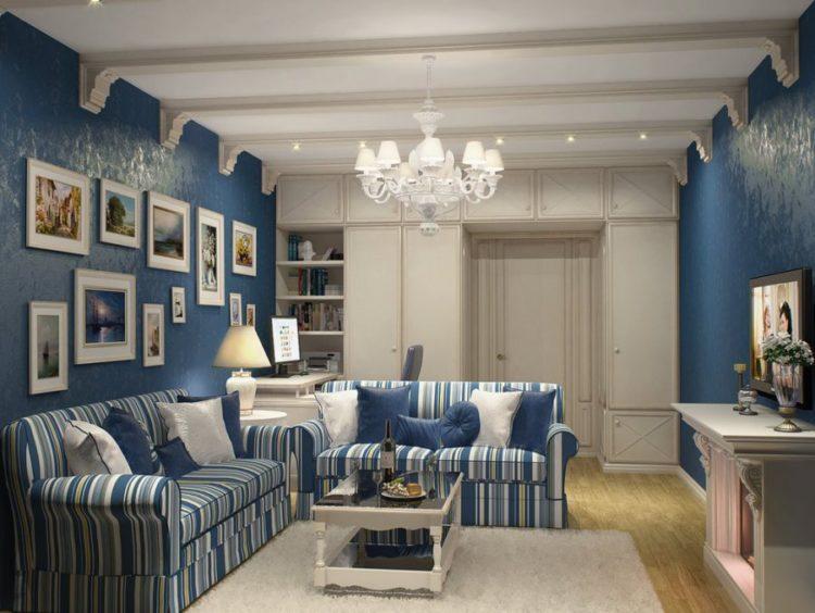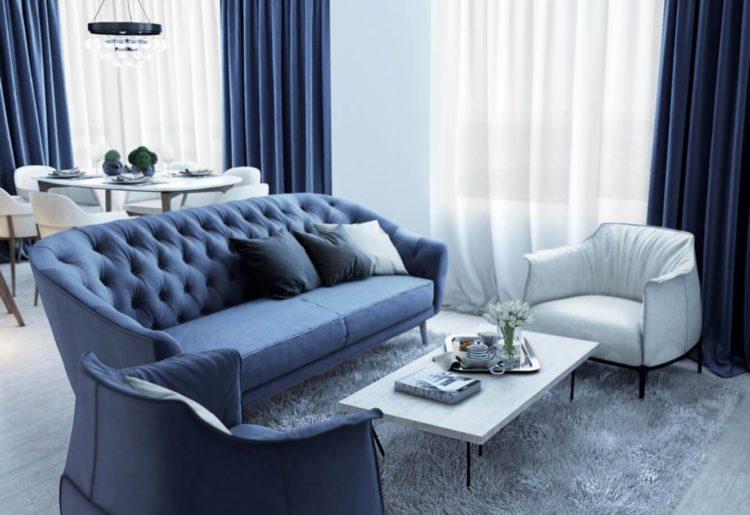 El diseño de la sala de estar en un apartamento o casa en azul es una buena opción para quienes gustan de los colores apagados. En una habitación azul, un sofá blanco y un armario se verán hermosos.