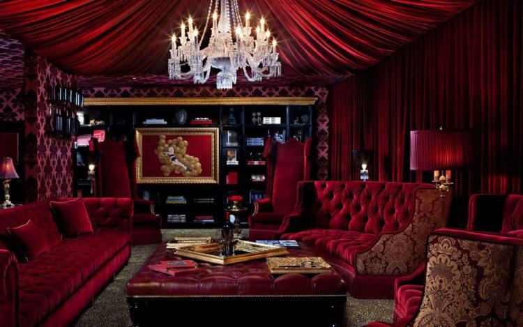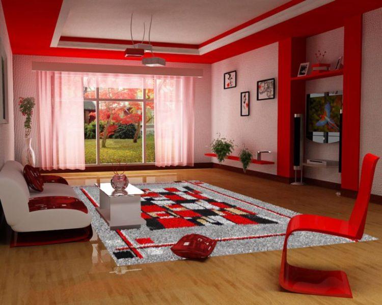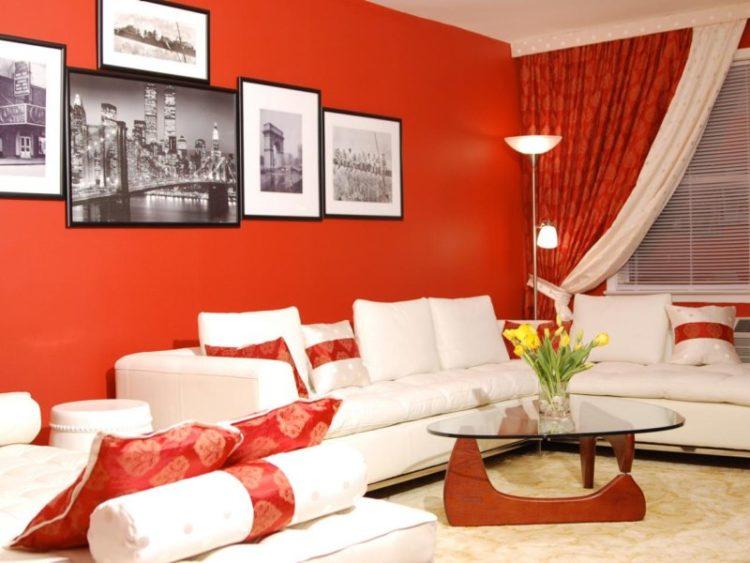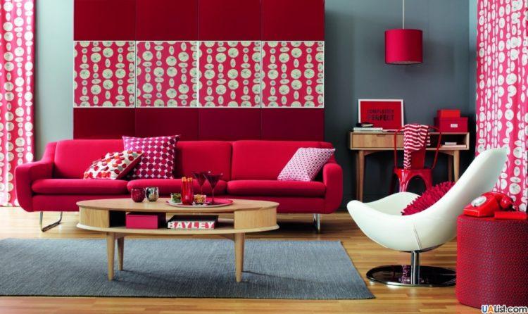 La sala de estar (diseño, interior y sus fotos, ver abajo), hecha en rojo, es una solución audaz pero muy interesante. ¿Por qué no decorar el gran salón con un color tan brillante?