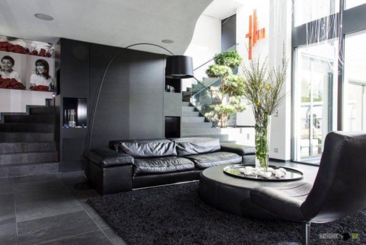 El interior negro de la sala de estar, cuya foto encontrará a continuación, atraerá a los amantes del minimalismo y la moderación. En combinación con el color blanco, dicha sala creará una sensación entre sus invitados.