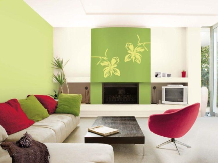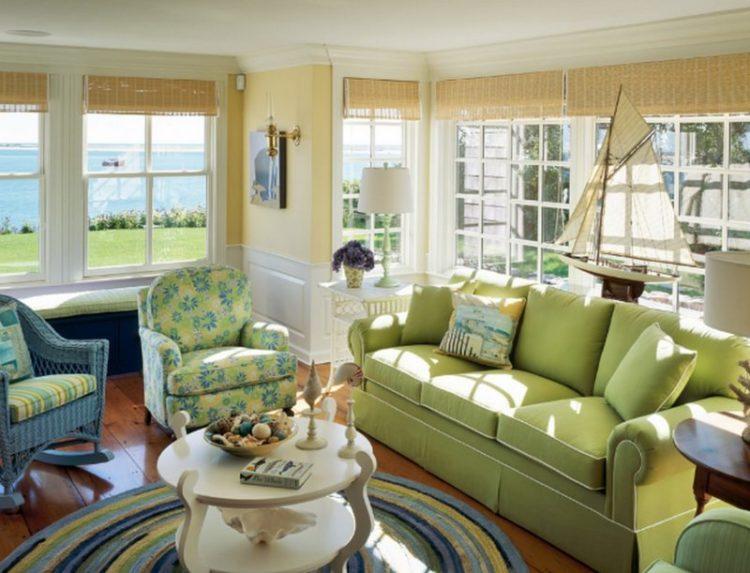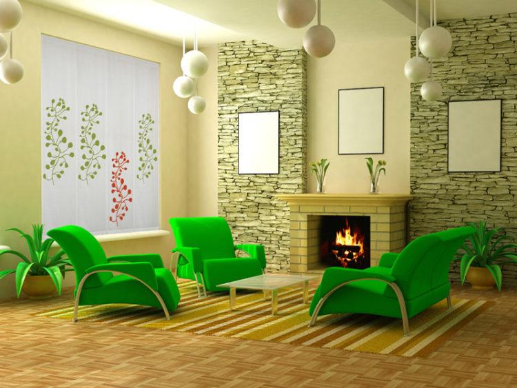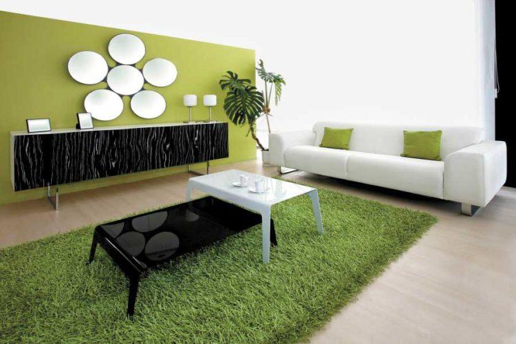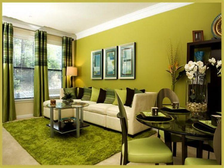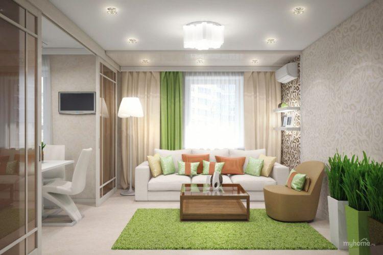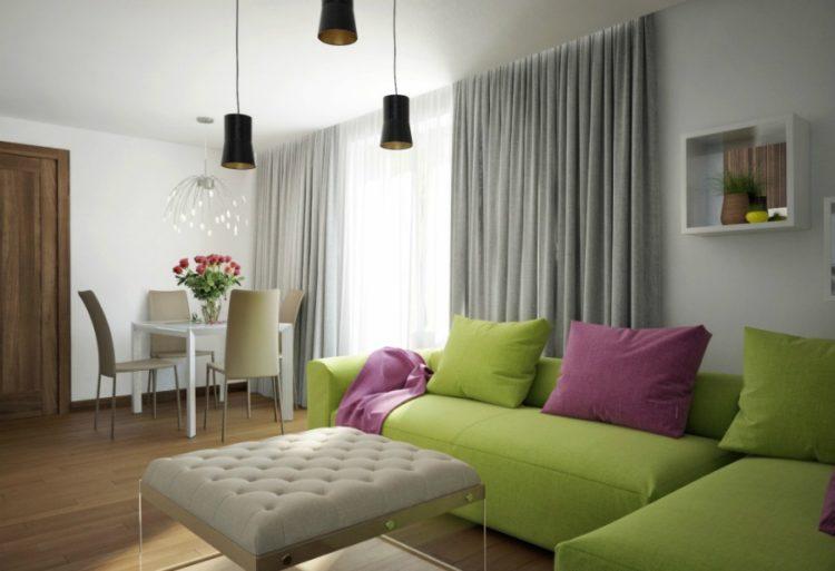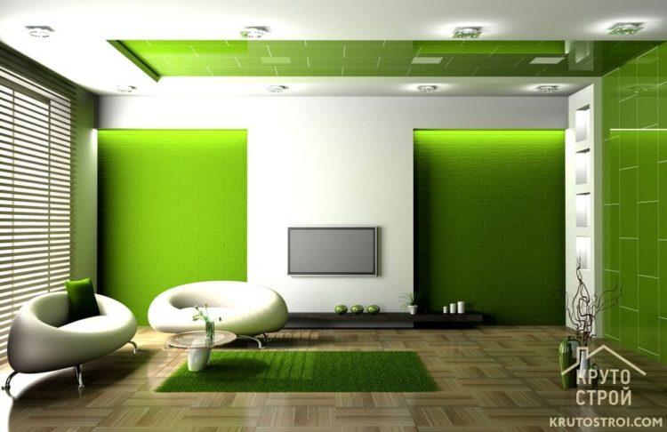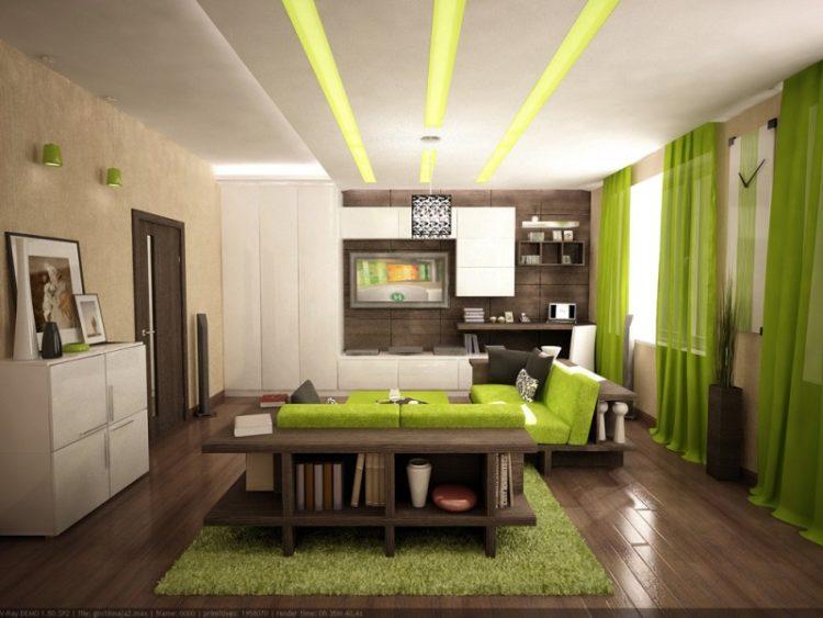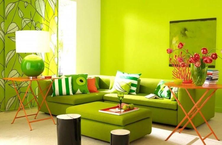 La sala de estar, cuyo interior está hecho en tonos verdes, se ve muy fresca. Esta opción es adecuada para los amantes de varias plantas que se pueden organizar en todo el salón.
