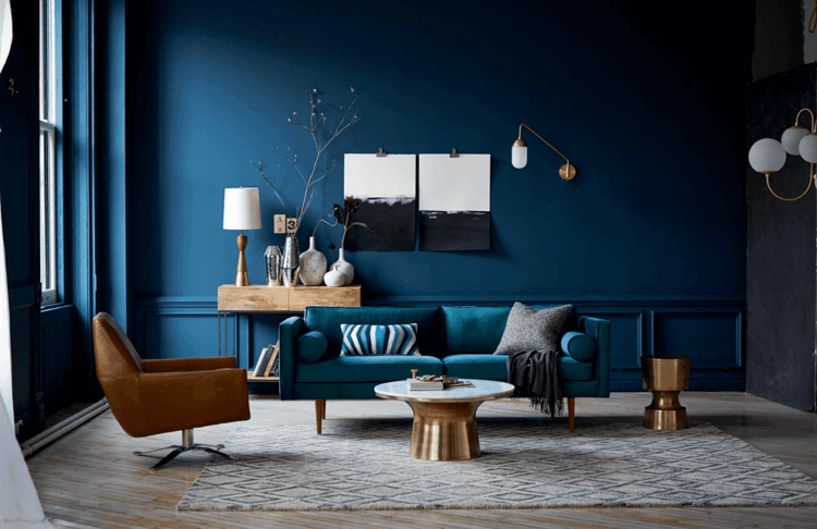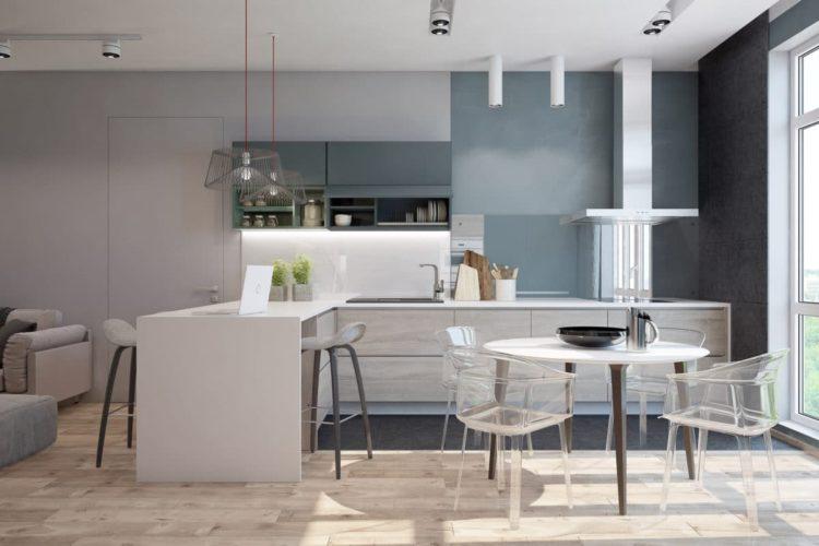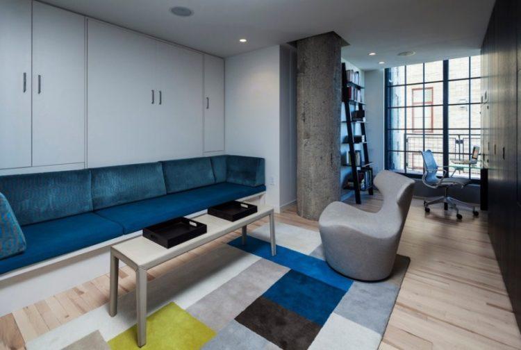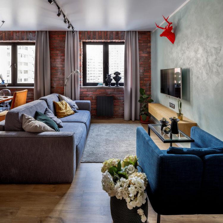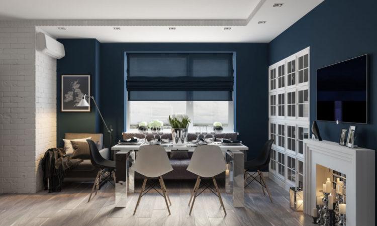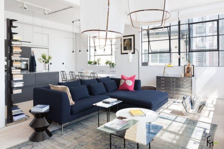 Los expertos señalan que el azul es un color único que combina perfectamente con el estilo loft. Un luminoso y pequeño salón tipo loft decorado en tonos azules contribuye a la relajación y la paz. Además, este color es un símbolo de éxito, confianza en sí mismo y estabilidad. Recientemente, el azul se ha convertido en la tendencia más de moda en el diseño de interiores de salas de estar. Salones en estilo loft en tonos azules en la foto:
