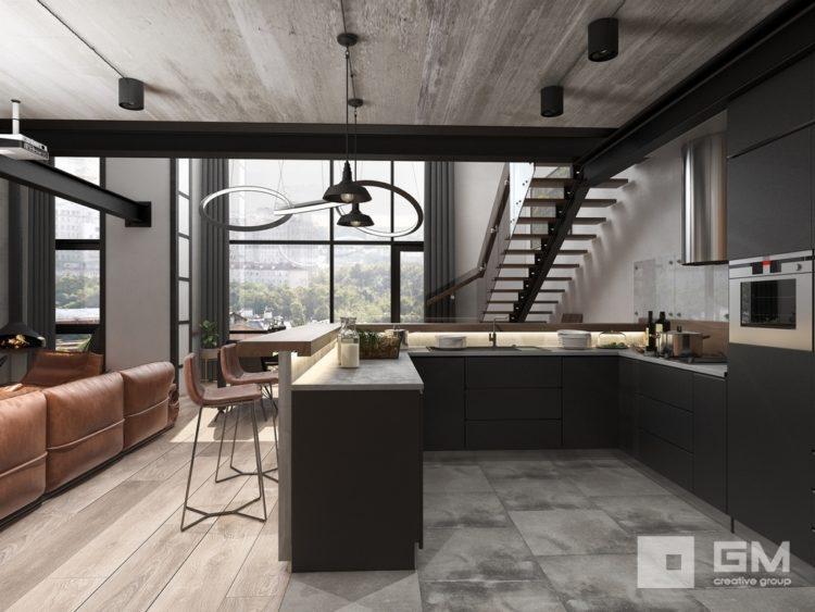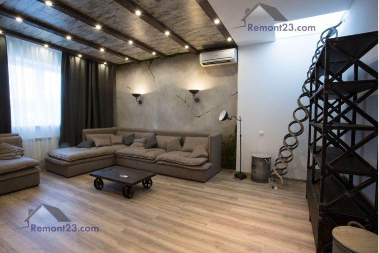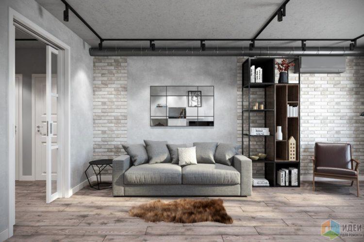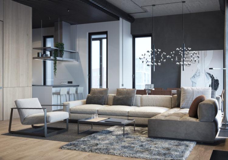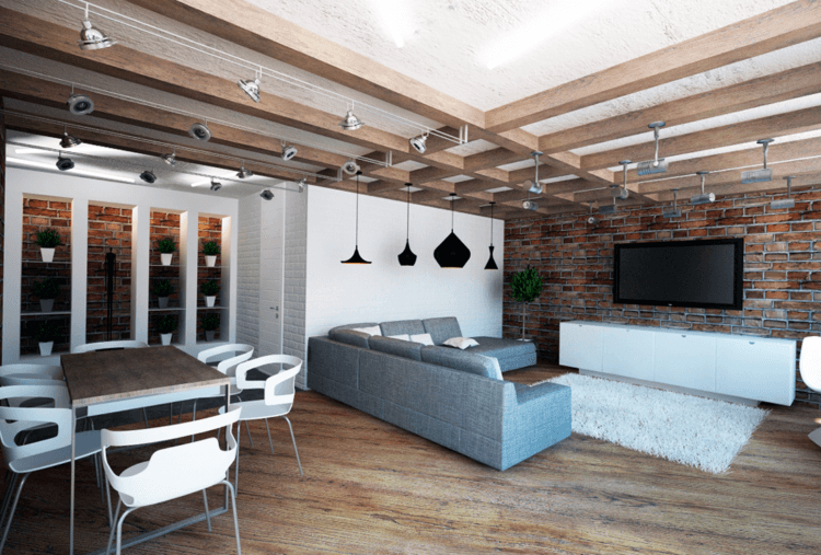 El gris es el color estándar para las salas de estar tipo loft. Se usa en todas partes. El interior puede estar presente en cualquier tono. No hay requisitos estrictos en este caso. Después de consultar con un diseñador experimentado, puede diseñar una sala de estar moderna en Jruschov en colores sobrios y darse cuenta de la idea de color más extravagante en todos los tonos de gris. Loft y foto combinada clásica: