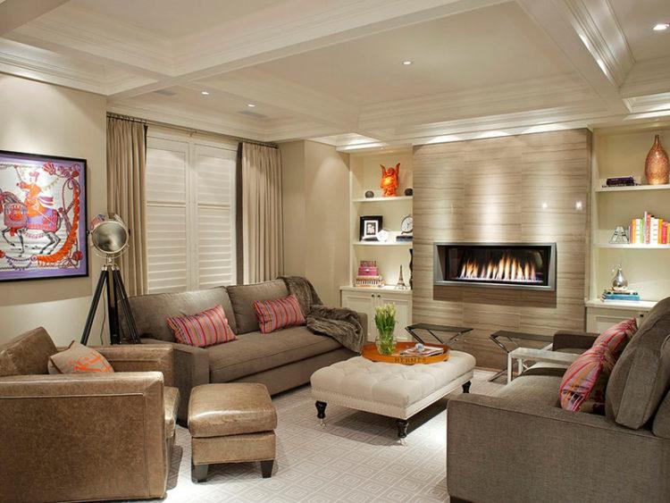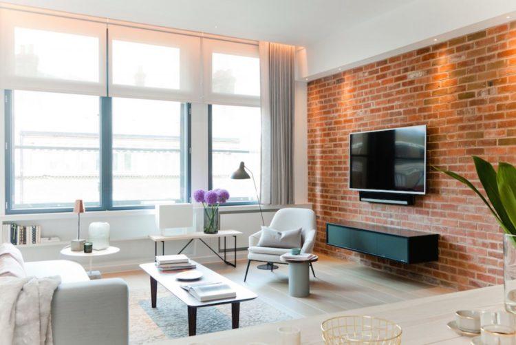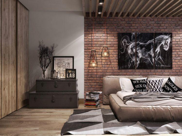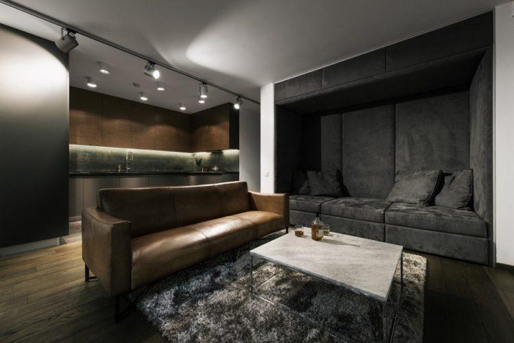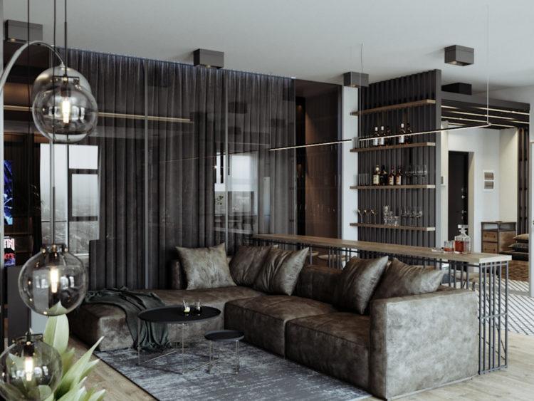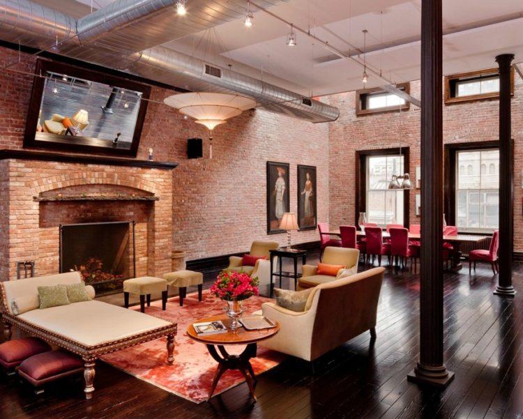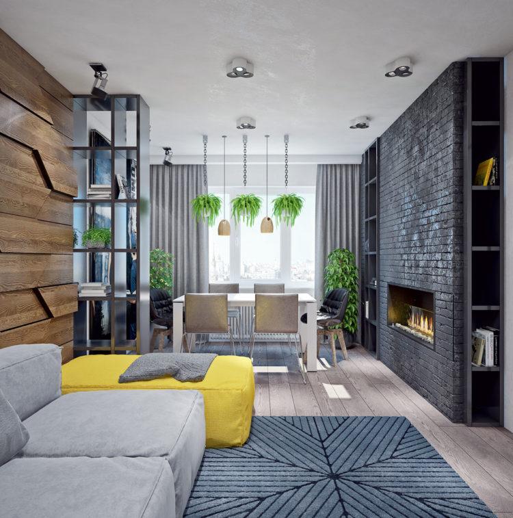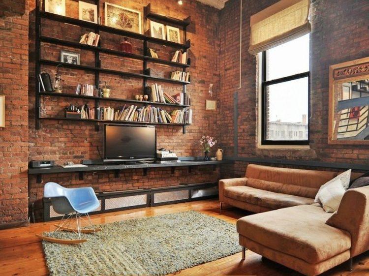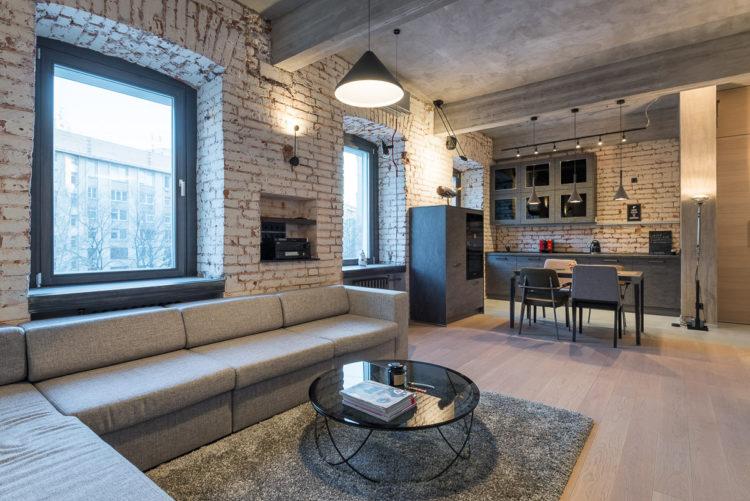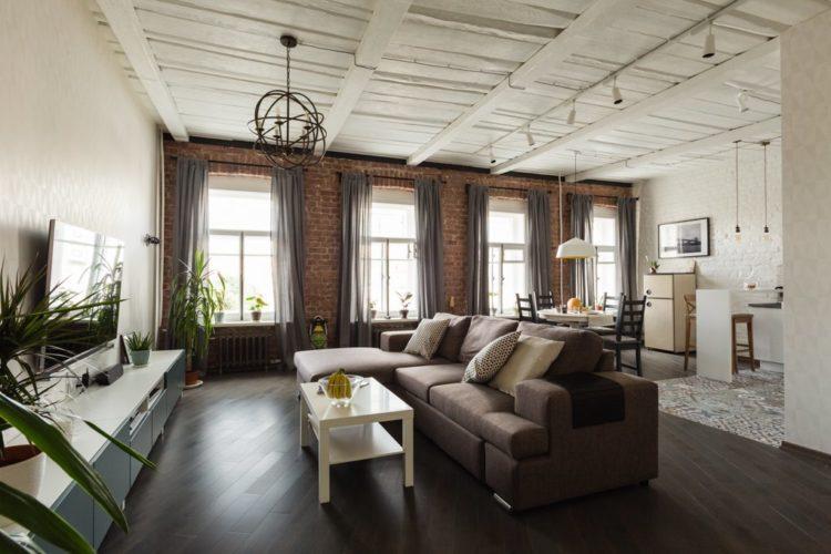 El interior marrón de la sala de estar tipo loft es particularmente cálido y confortable. Muchas personas asocian este color con chocolate suave y café aromático. La sala de estar con chimenea tipo loft se verá elegante si piensa en la combinación de colores correcta. El marrón es el color de la madera, un material indispensable en la decoración de las habitaciones. Los muebles de cuero, las cortinas y la decoración con una pared de ladrillos en tonos marrones enfatizan el estado del propietario y también lo caracterizarán como una persona que aprecia la calidad y la durabilidad.