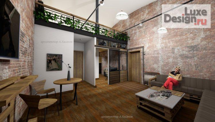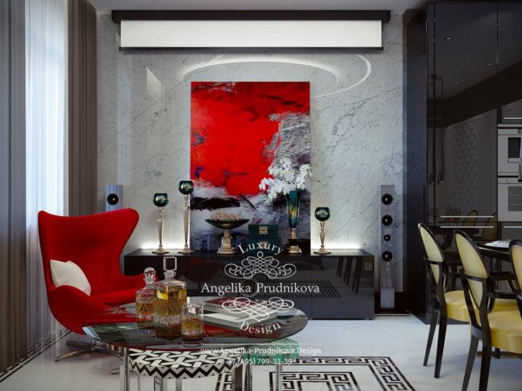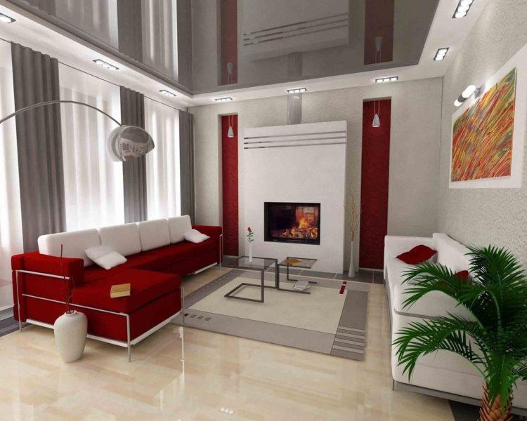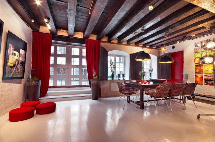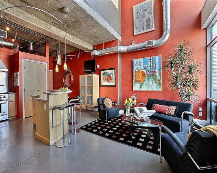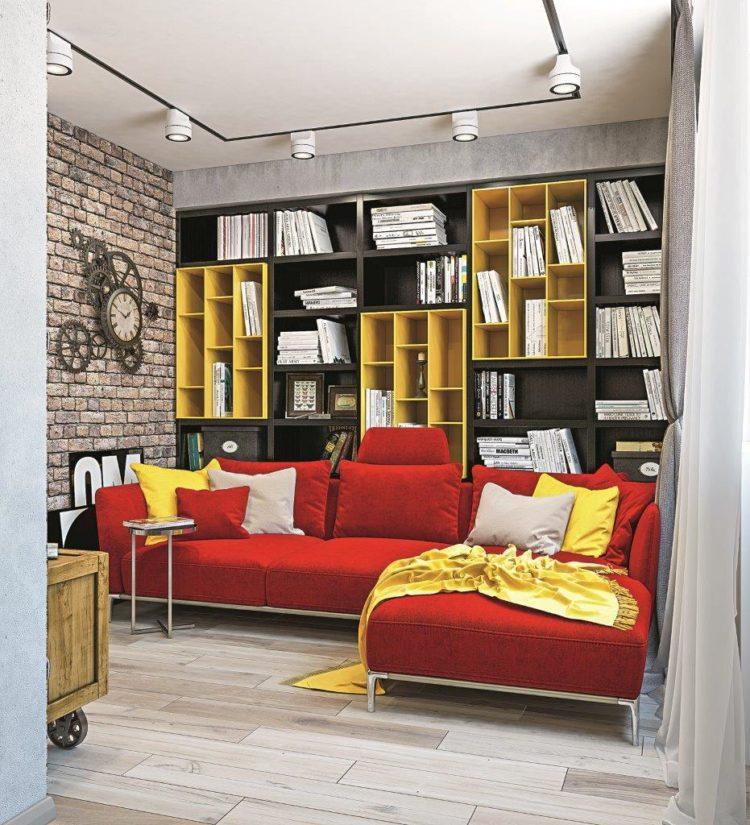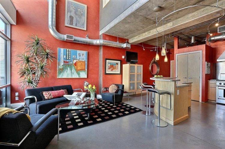 La habitación tipo loft de estilo rojo con elementos elaborados seguramente lo deleitará con su impresionante diseño. Se sabe que el rojo es un símbolo de la llama eterna, el fuego, por lo tanto, de acuerdo con las enseñanzas del Feng Shui, le da a una persona una carga de energía vital. Para una sala de estar tipo loft pequeña y con poca luz, no use tonos saturados de rojo, ya que sobrecargarán sus ojos y ocultarán el espacio.