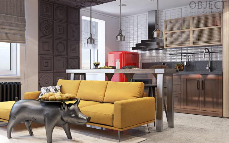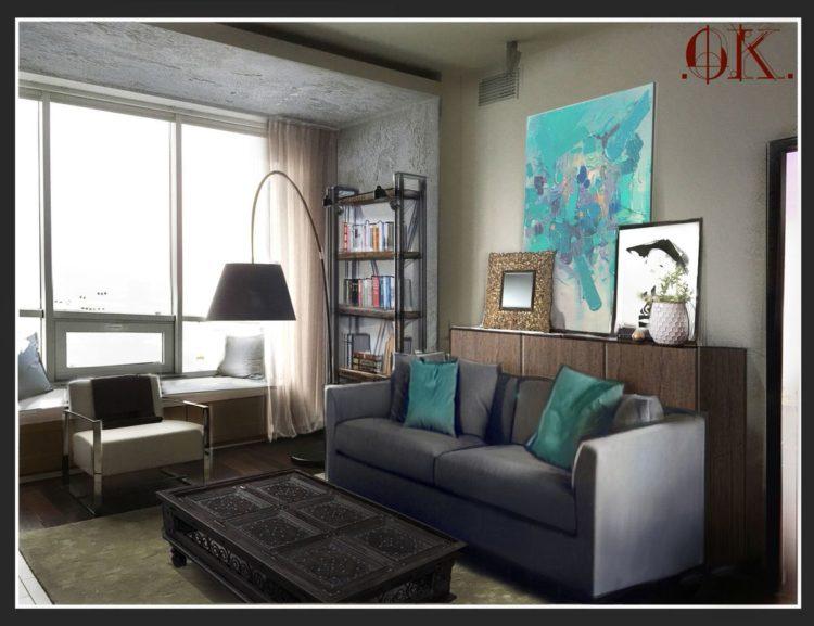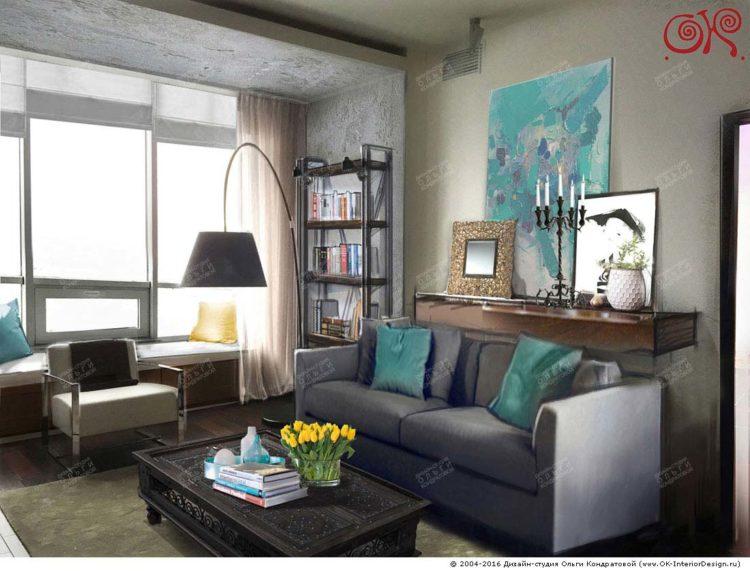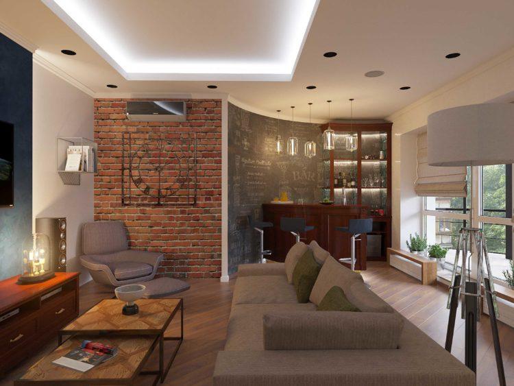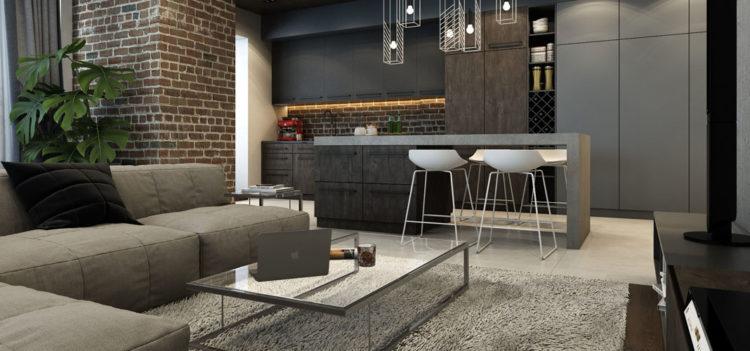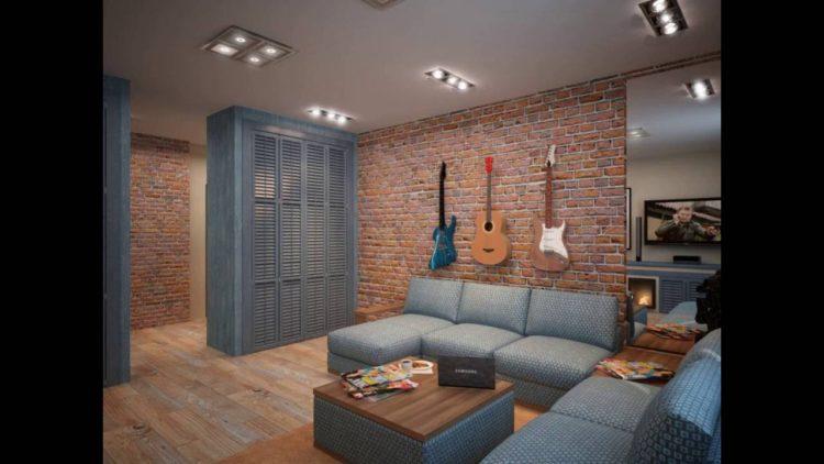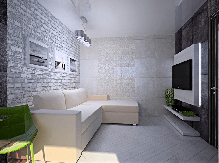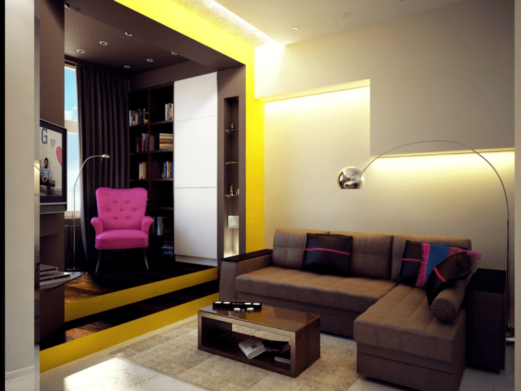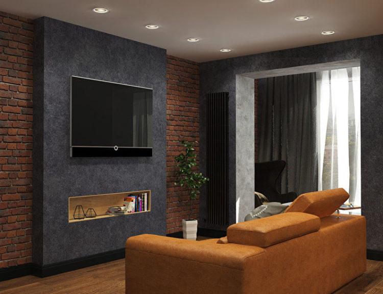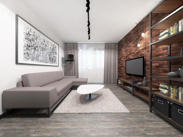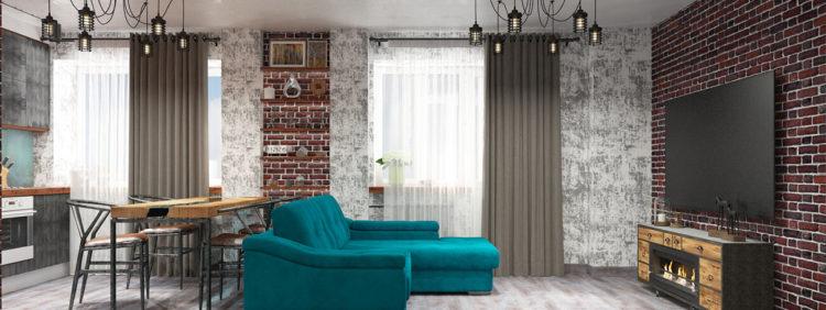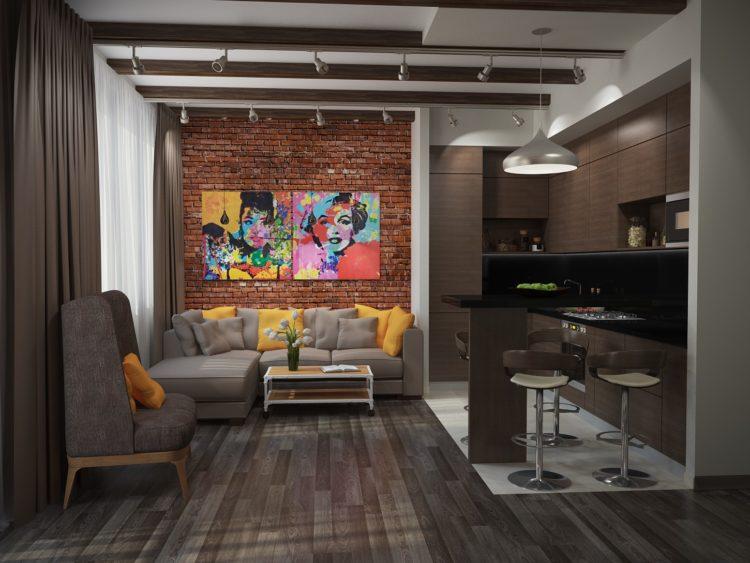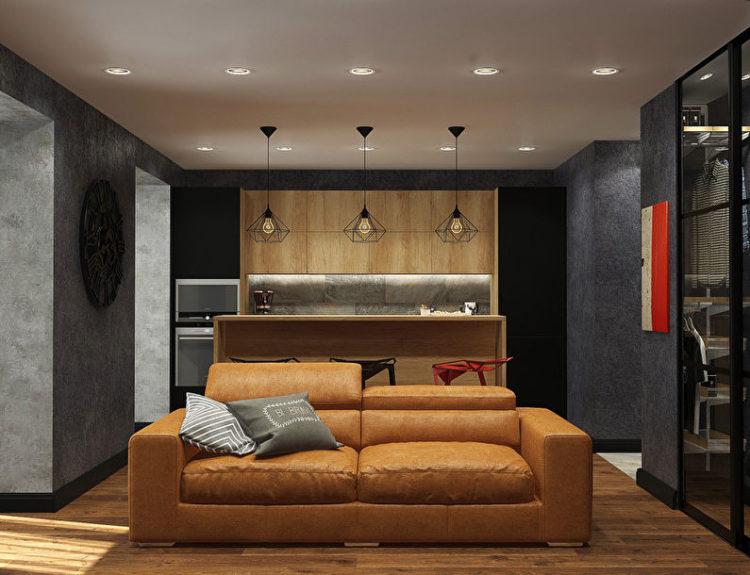 Los tonos fríos, las designaciones individuales brillantes crearán el ambiente adecuado y enfatizarán el estilo industrial del loft en la sala de estar. Es costumbre hacer un loft clásico sombrío en tonos apagados. Los colores obsesivos se usan solo para resaltar detalles. Los colores acromáticos lideran el interior. Los tonos de marrón, oliva, bronce también son populares. Un diseñador experimentado puede diseñar una sala de estar moderna en Khrushchev en colores sobrios y realizar la idea de color más creativa.