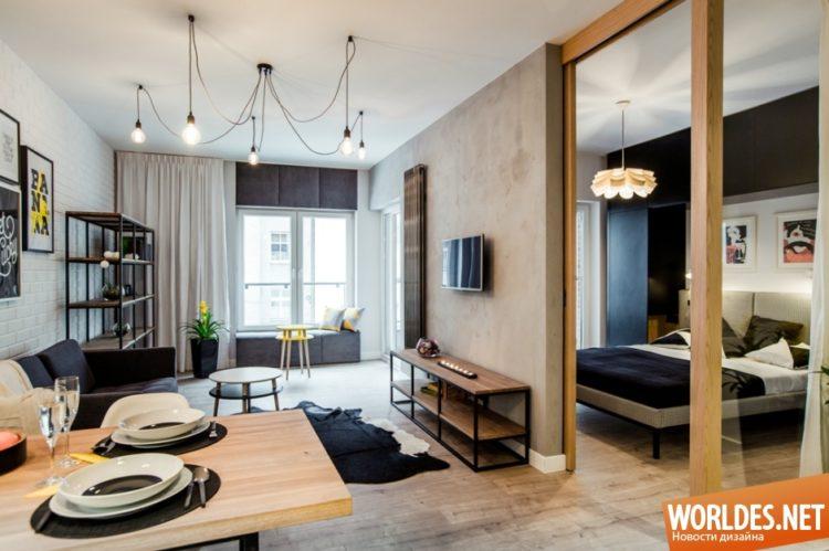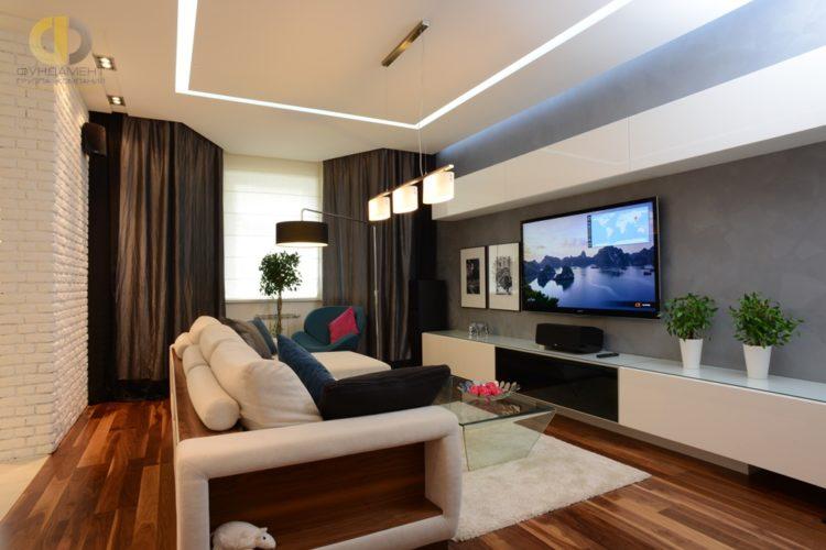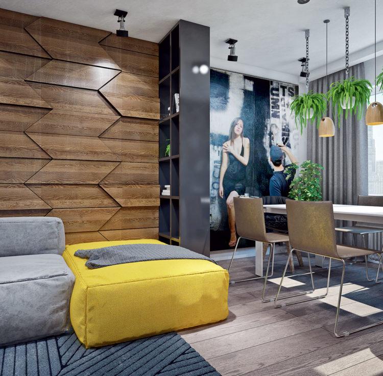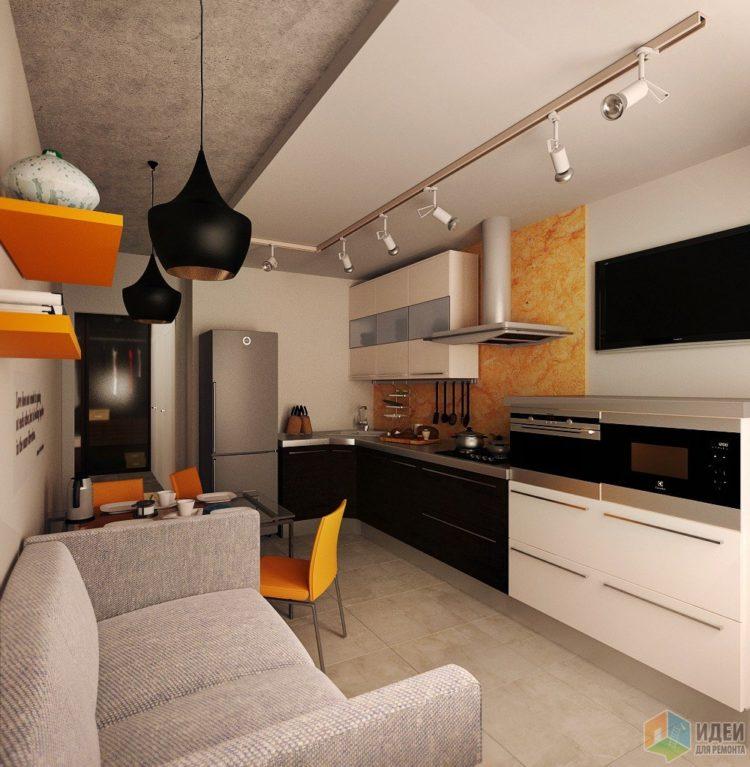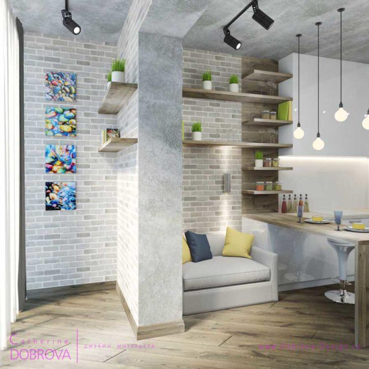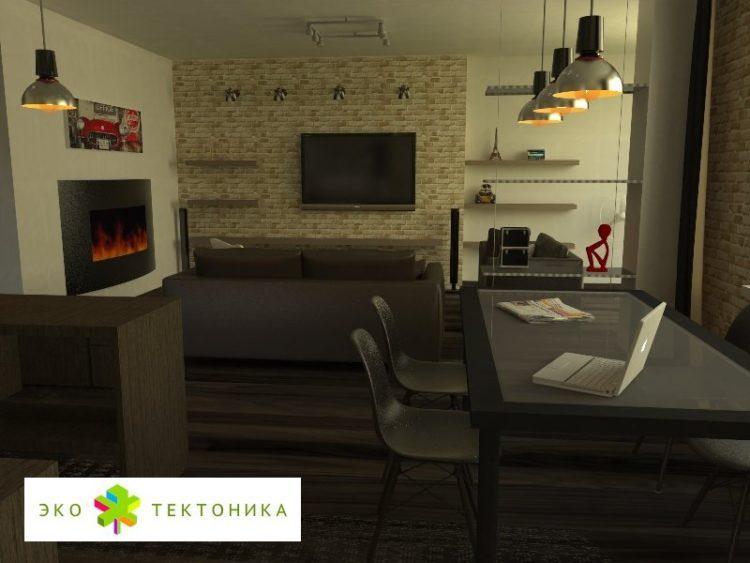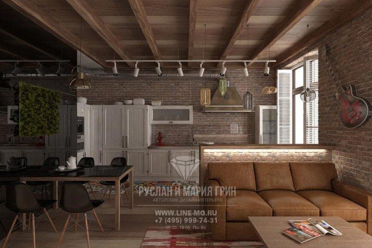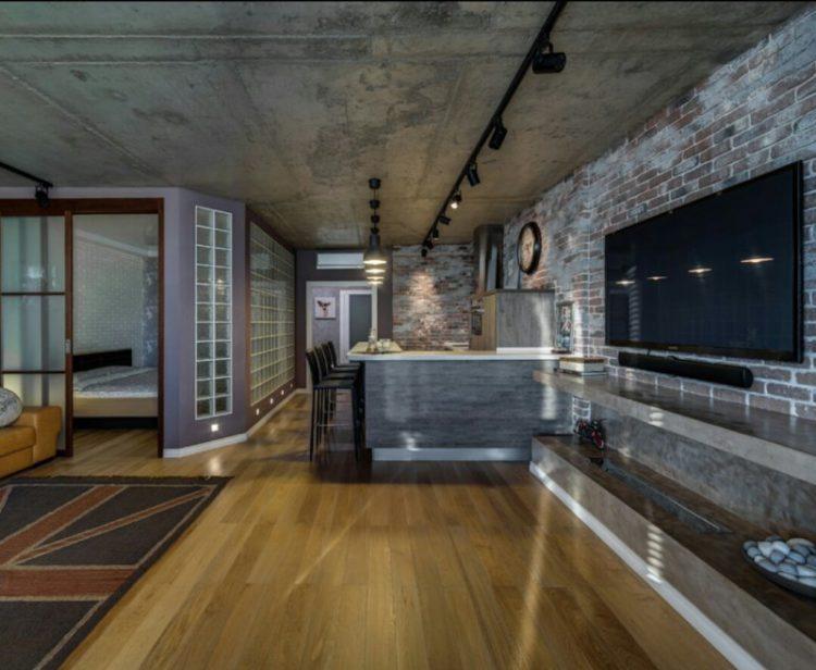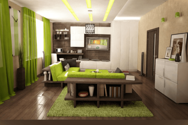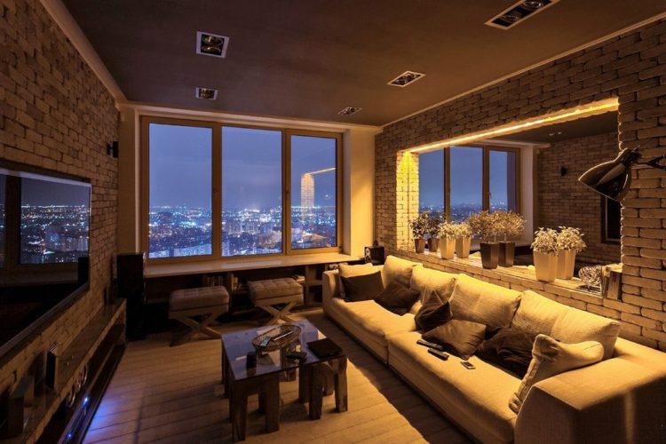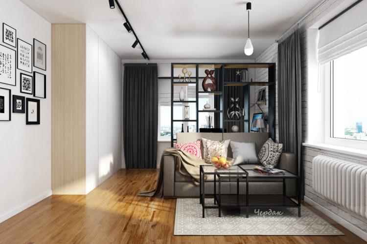 Los tonos fríos, las designaciones individuales brillantes crearán el ambiente adecuado y enfatizarán el estilo industrial del loft en la sala de estar. Es costumbre hacer un loft clásico sombrío en tonos apagados. Los colores obsesivos se usan solo para resaltar detalles. Los colores acromáticos lideran el interior. Los tonos de marrón, oliva, bronce también son populares. Un diseñador experimentado puede diseñar una sala de estar moderna en Khrushchev en colores sobrios y realizar la idea de color más creativa.