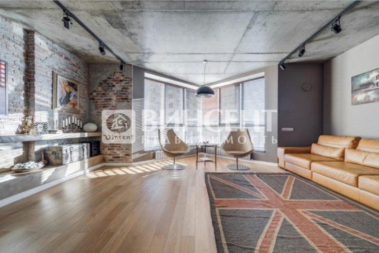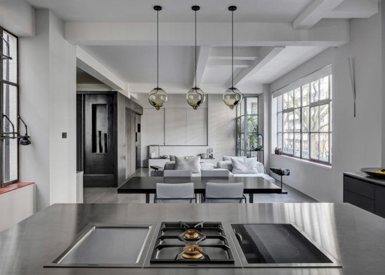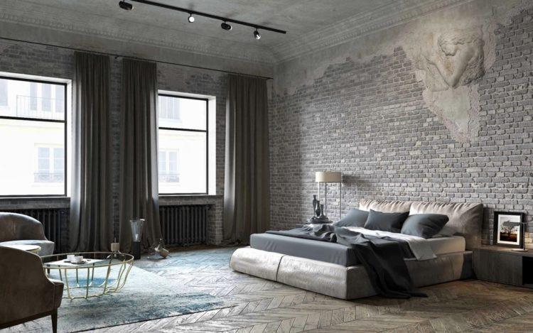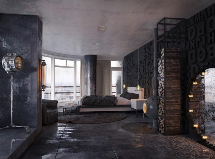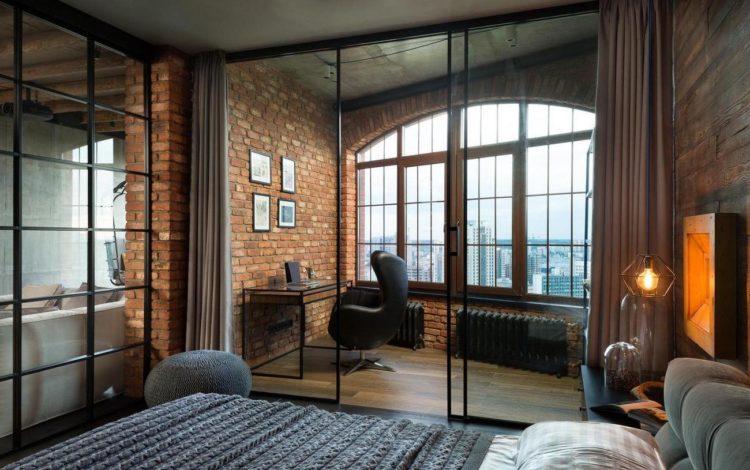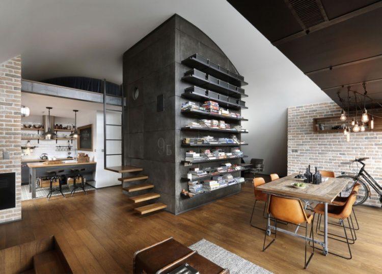 La moderación es otra característica específica del estilo loft. Los tonos naturales, el uso activo de tonos grises, negros y blancos se reflejan en la decoración de paredes, pisos y techos. Los tonos brillantes se usan para enfatizar ciertos acentos importantes: tapicería de un sofá y sillones, estanterías con libros, varios accesorios. El fondo general es gris, enfatizando la enormidad del espacio.