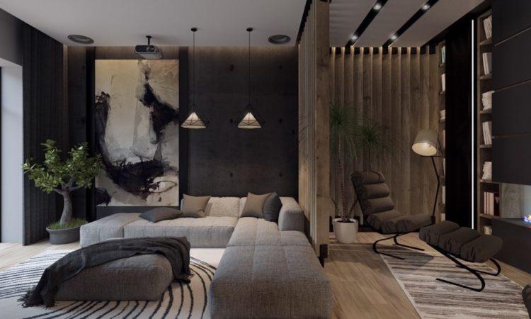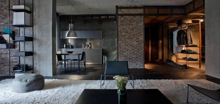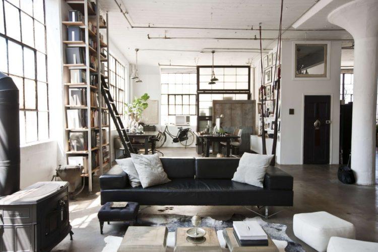 El diseño de la sala de estar en el estilo loft no implica el color de la habitación en negro. Puede usar el diseño de dos colores de la sala, por ejemplo, blanco y negro, negro y amarillo, negro y rojo y similares. Todo depende del gusto del dueño del apartamento. Además, el color negro es bienvenido como parte de los elementos decorativos de la habitación: almohadas, cuadros, una alfombra junto al sofá y otras cosas.