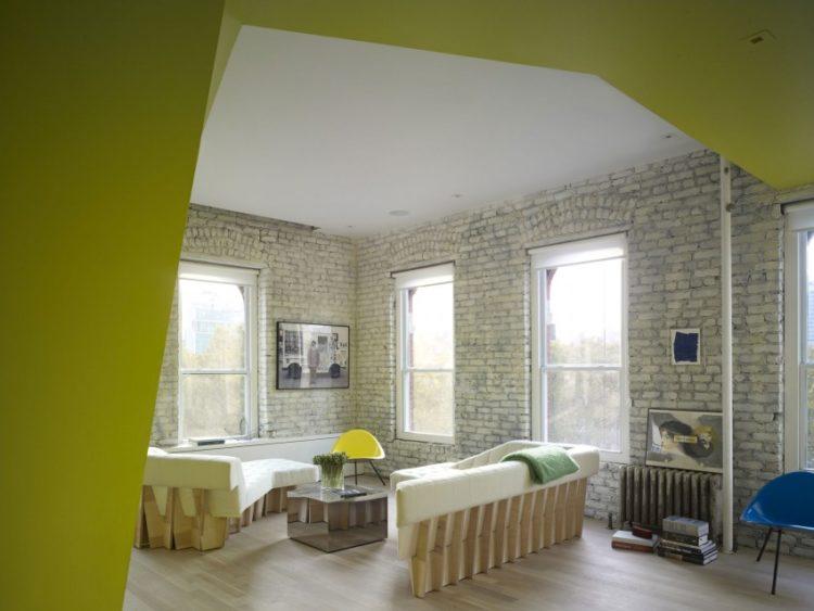Un loft en colores brillantes es una ocurrencia bastante rara. Sin embargo, los colores claros y brillantes se utilizan activamente para la tapicería de muebles tapizados, diseño de estantes, etc. Evite el vacío de un interior brillante y la posible impresión de aburrimiento en la gran sala de estar tipo loft creando "puntos de enfoque". Los textiles brillantes con un patrón grande ayudarán en esto. Es importante elegir el color y la textura apropiados.