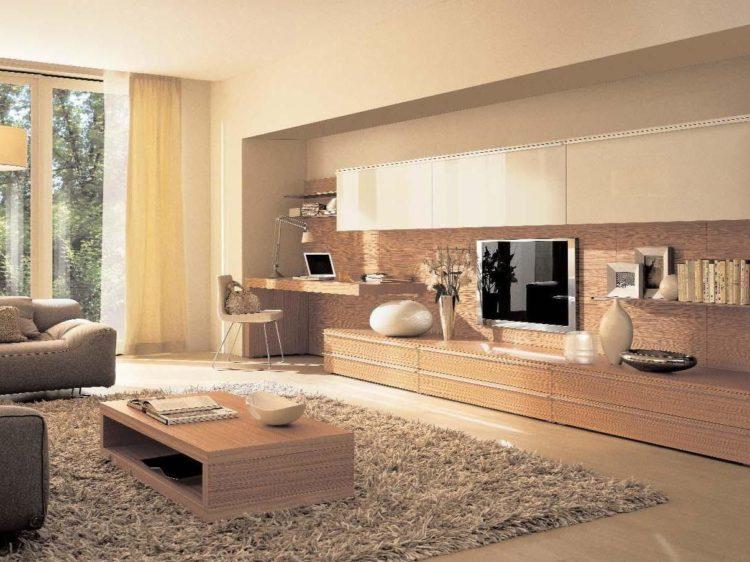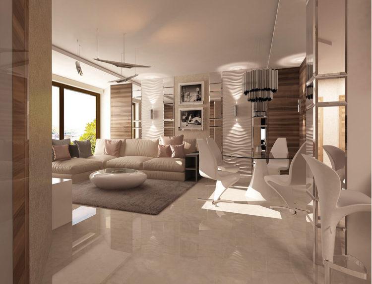 Si quieres que la habitación sea moderadamente cálida y más cómoda, usa beige. En todas las situaciones ambiguas, vale la pena echar un vistazo más de cerca al color beige, ¡porque es una "clave" universal para casi cualquier interior! Los frescos interiores de las casas decoradas en tonos beige se presentan en la foto a continuación.