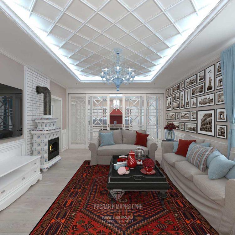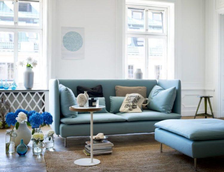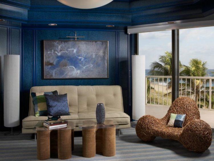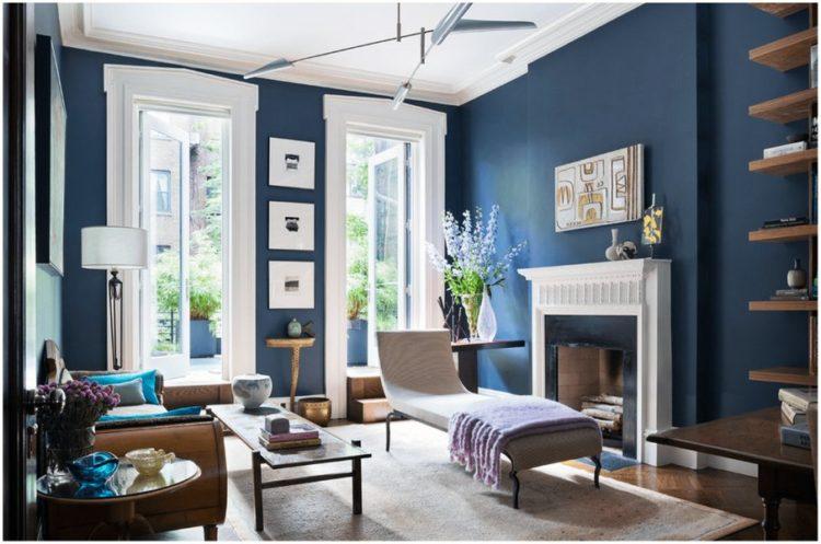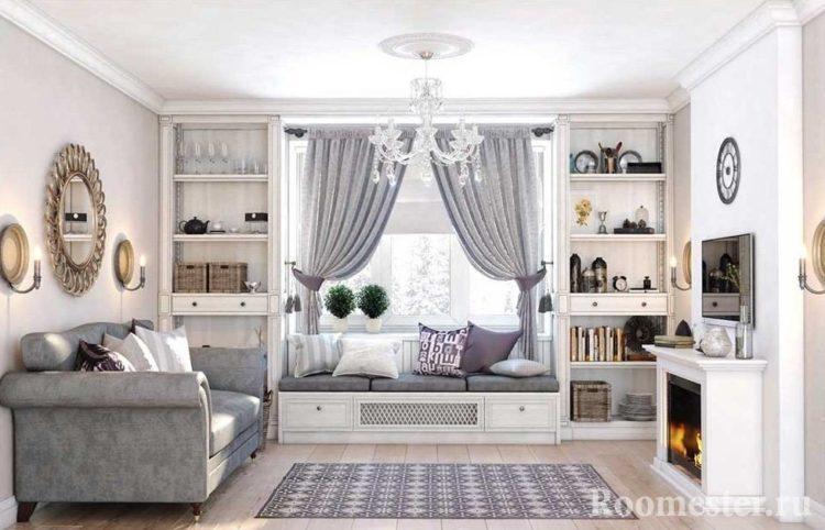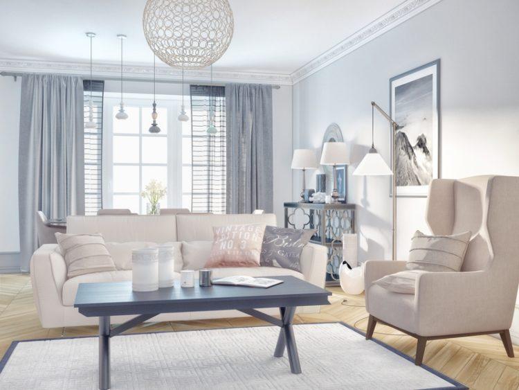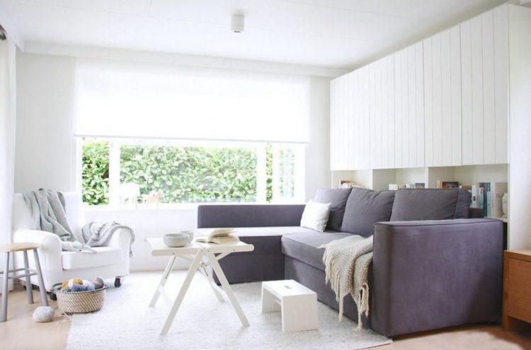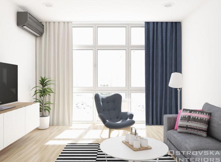 El hermoso interior de la sala de estar o dormitorio, cuyas ventanas dan al sur, ayudará visualmente a que la gama gamma fría del espectro sea más cómoda: tonos azules, lilas y azules.