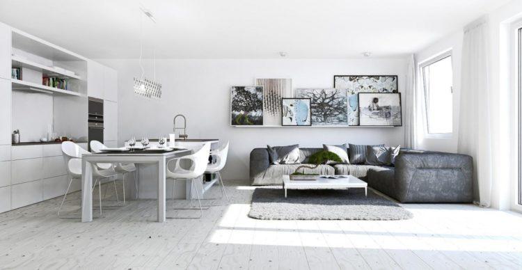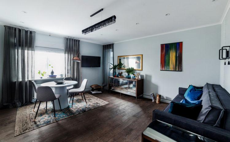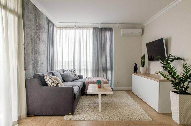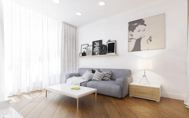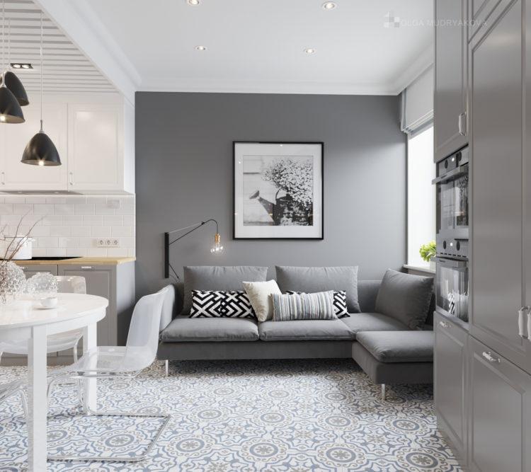 La decoración de un apartamento de una habitación en tonos grises no necesariamente evoca aburrimiento y abatimiento. Este es un ejemplo bastante elegante de renovación moderna en un apartamento de 1 habitación.