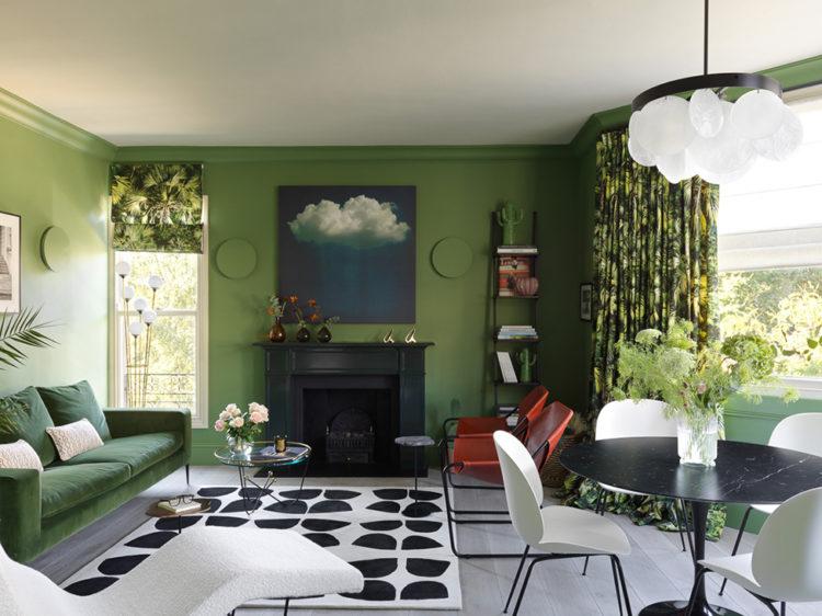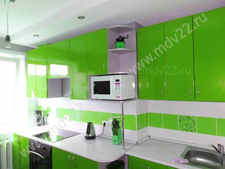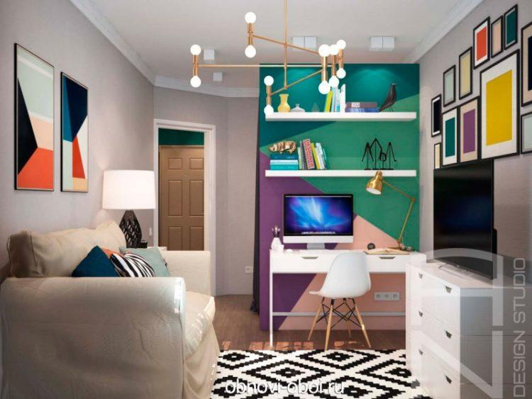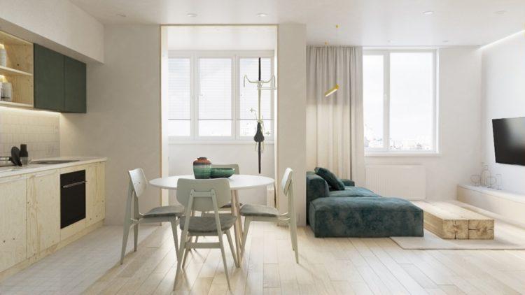 En la foto puedes ver las opciones para reparar un estudio en colores verdes. La mayoría de las veces, odnushka usa papel tapiz verde o decoración de paredes.