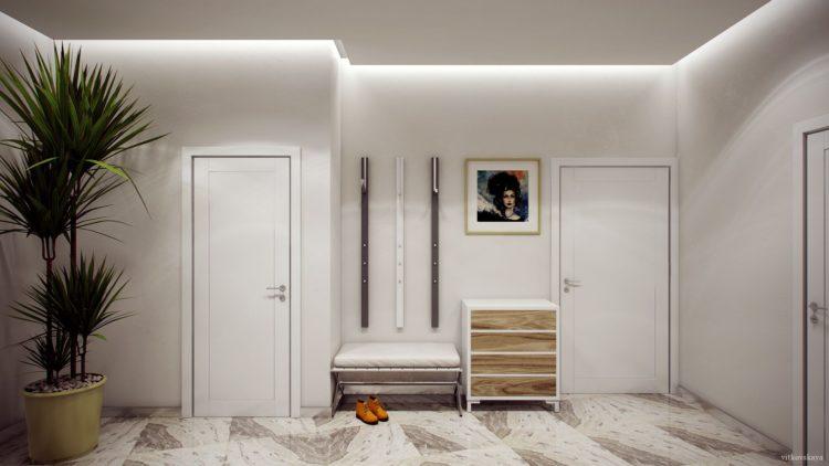 El interior de un pequeño pasillo en colores blancos es la mejor solución, pero debe estar preparado para el hecho de que no será demasiado práctico, especialmente en climas lluviosos y húmedos.