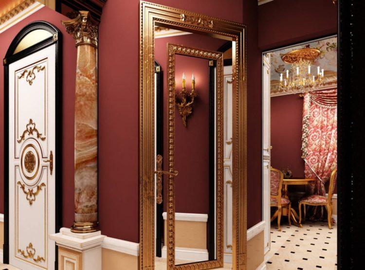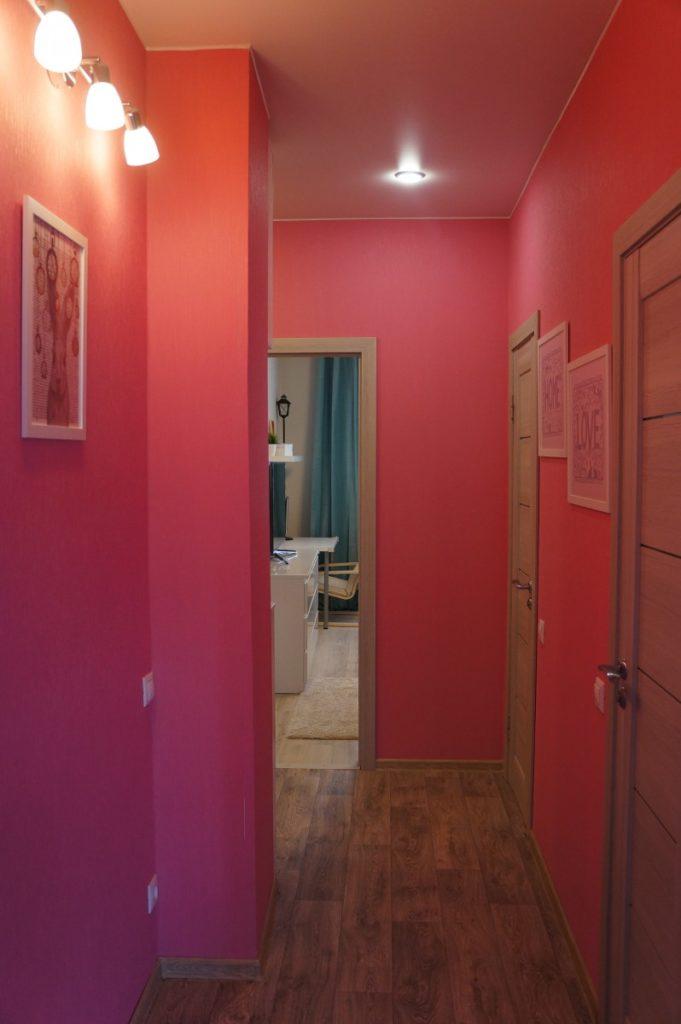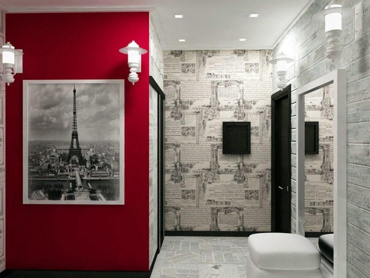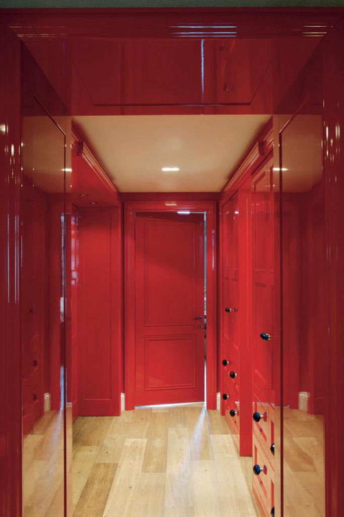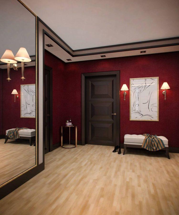 El diseño del pasillo en tonos rojos es una solución bastante audaz y extraordinaria. Para quienes gustan de colores más tenues, el rojo se puede diluir con un tinte blanco o gris.
