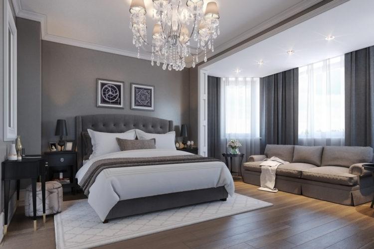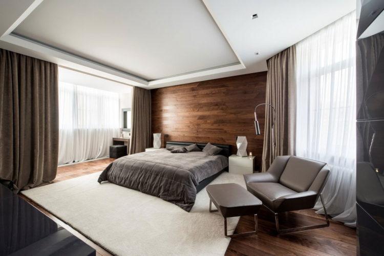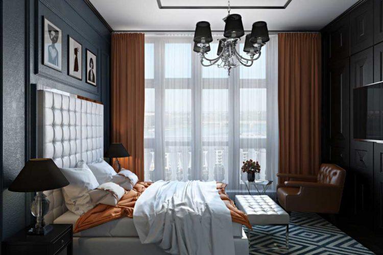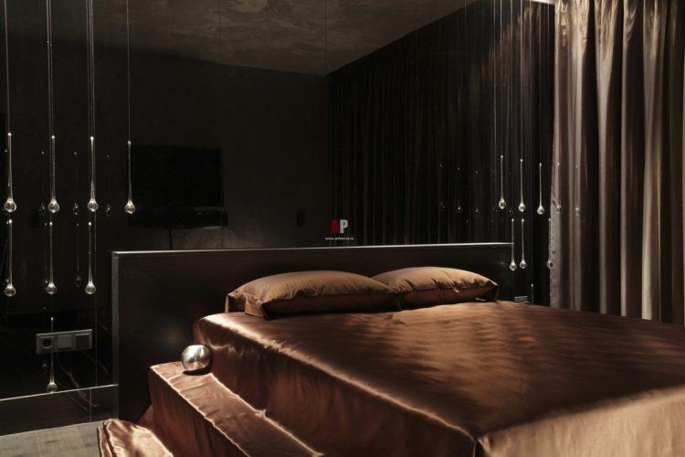 Los interiores de la habitación en color oscuro son adecuados para los amantes del sueño y para aquellos que aprecian especialmente la paz y la tranquilidad. El diseño de dormitorio de color oscuro relaja y alivia la vista.