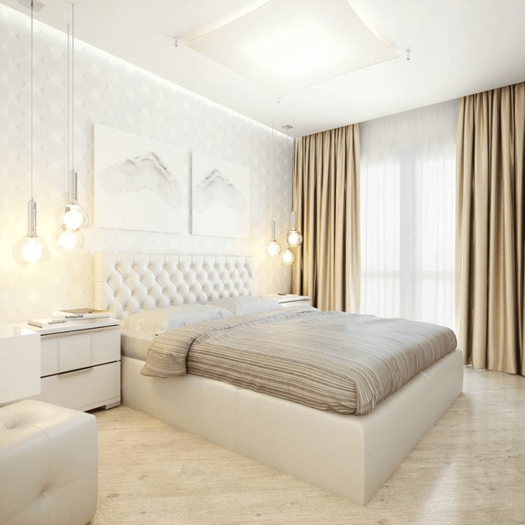 Las habitaciones modernas están hechas principalmente en colores beige. Este color armonioso es adecuado tanto para dormitorios grandes como pequeños.