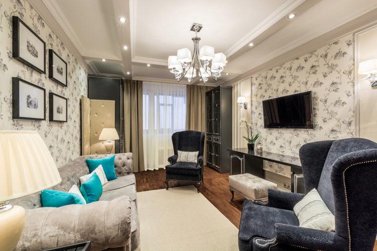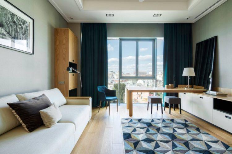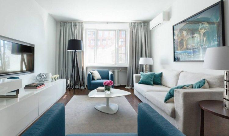 Los interiores azules o azules de la sala del apartamento, cuyas fotos se adjuntan a continuación, son más adecuados para aquellos cuyas ventanas dan al sur. Si las ventanas de la sala están orientadas al norte, entonces con colores azules debe tener cuidado de no dar a la habitación una apariencia sombría.