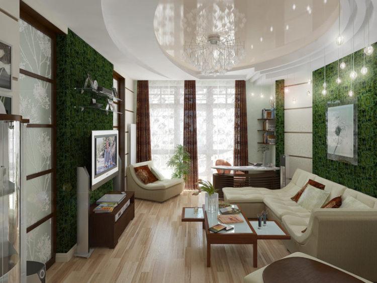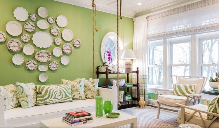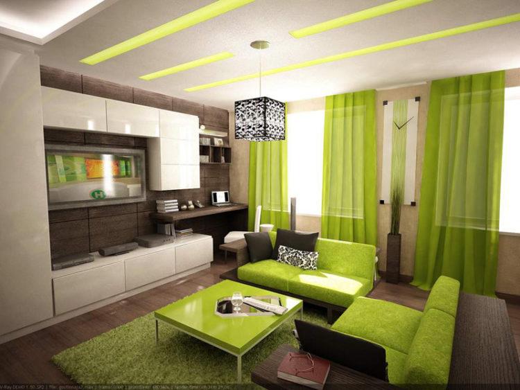 Hay más ideas originales para el salón, que implican el uso de colores brillantes, por ejemplo, el verde. Una habitación de ese color se verá especialmente bien si sus ventanas miran hacia el norte.