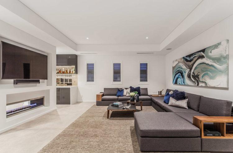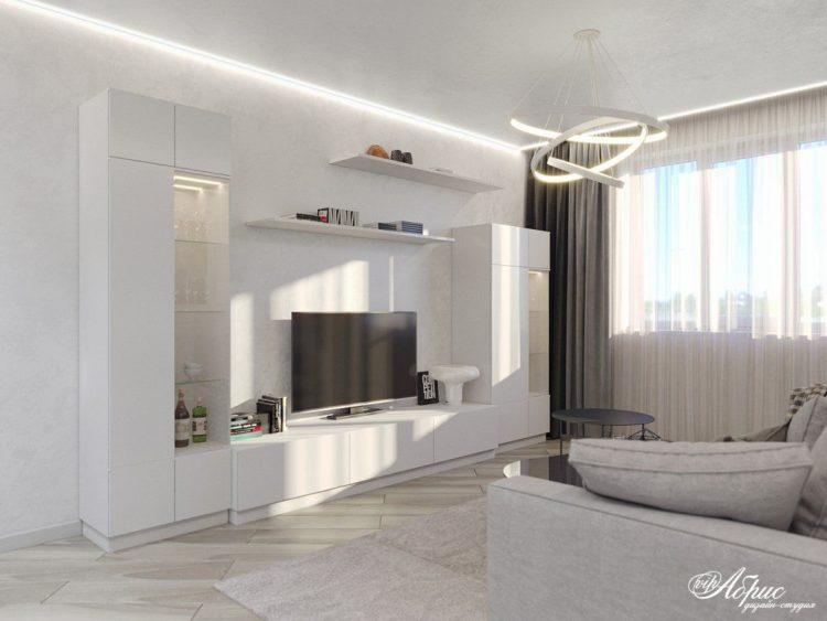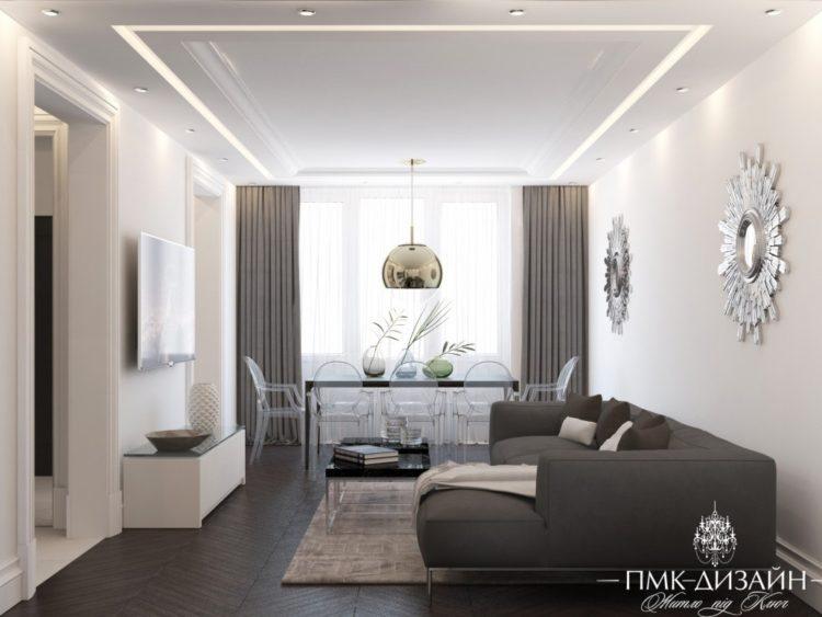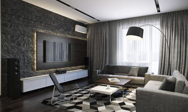 La sala de estar, cuyo diseño, interior y estilo está construido en gris, se ve muy moderna. Además, el color gris es universal y se adapta a cualquier interior.