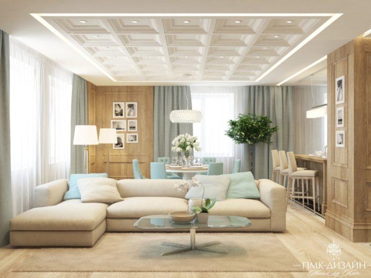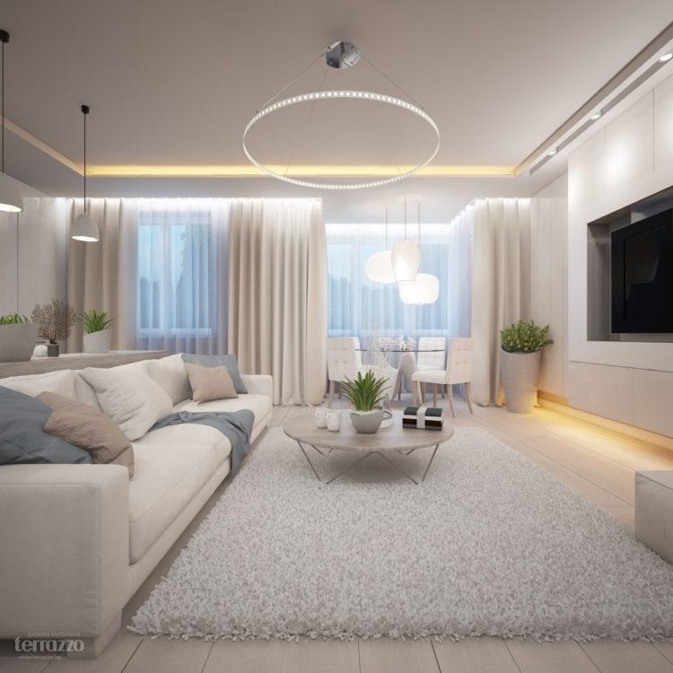 El diseño de sala de estar más común, cuyas fotos puedes ver a continuación, está hecho en colores brillantes. Sofás, mesas, sillones, alfombras, paredes, pisos ... Todo esto con un rendimiento ligero se ve muy elegante.