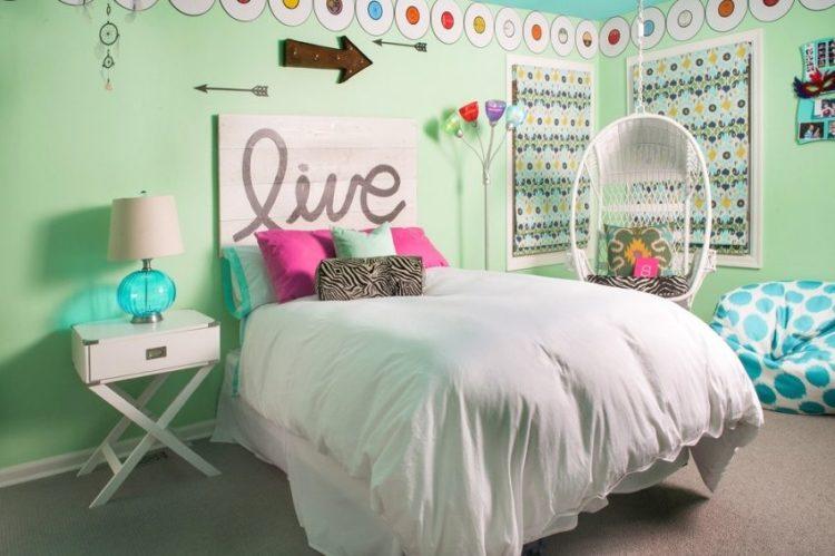 Para obtener hermosas habitaciones para niñas en verde y sus tonos, es necesario hacer la decoración de la pared principal. Esto lo preparará para una creatividad positiva, excitante y calmará a los niños hiperactivos.