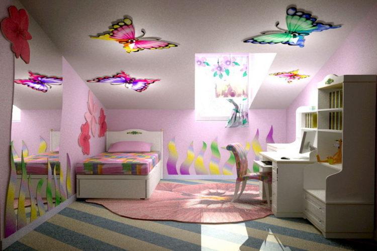 Si la habitación de los niños para niñas es pequeña, e incluso con una geometría compleja en el diseño o la arquitectura, el color claro a menudo se convierte en la única opción ganadora para decorar paredes y techos.