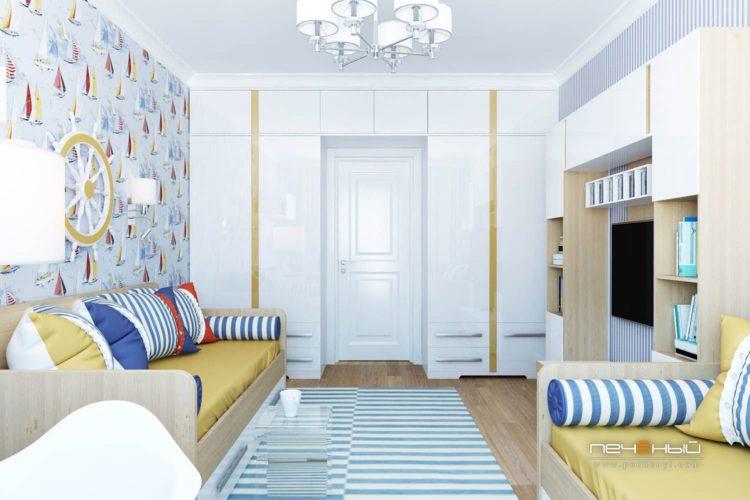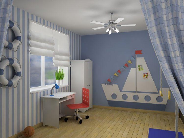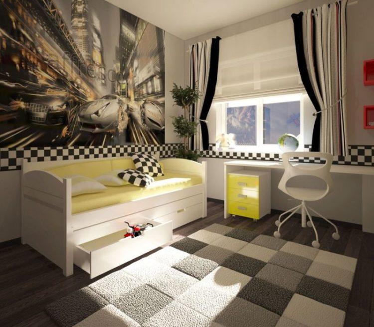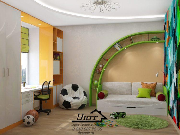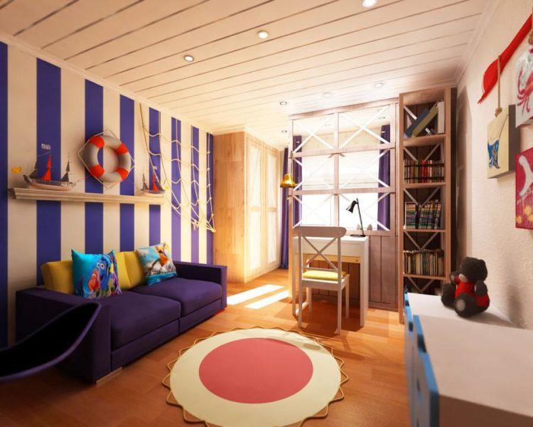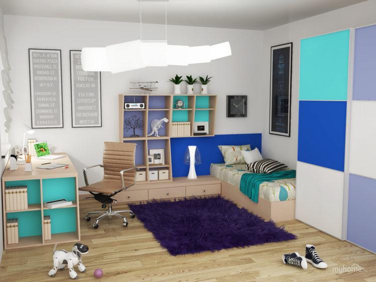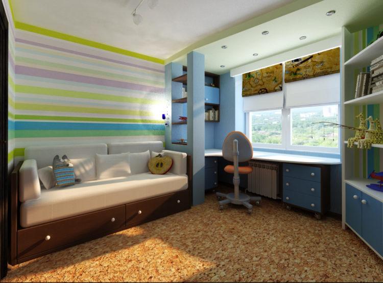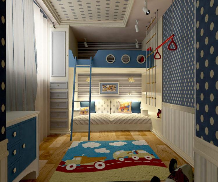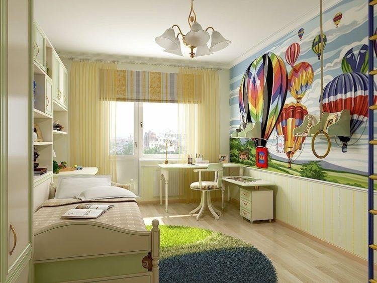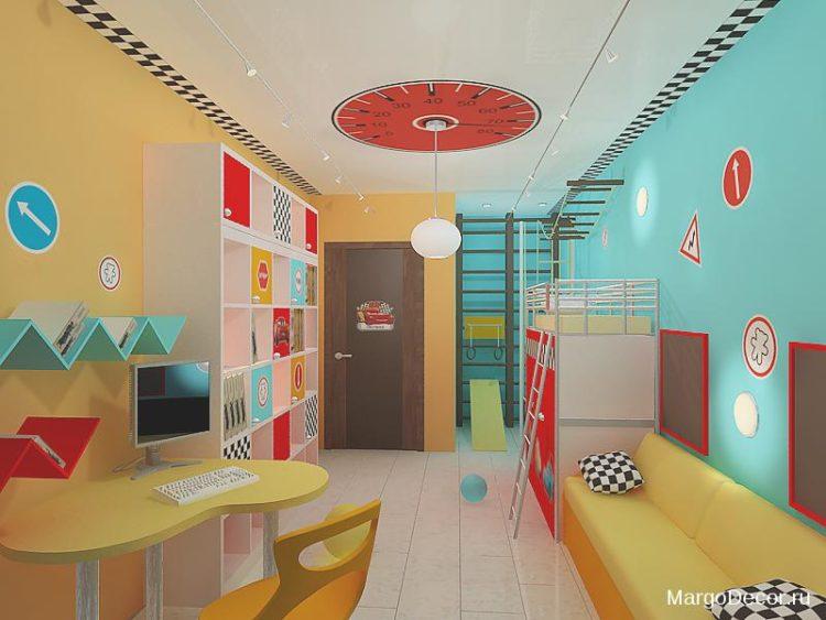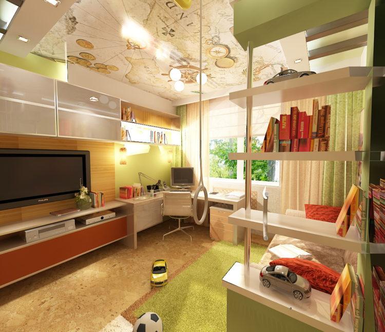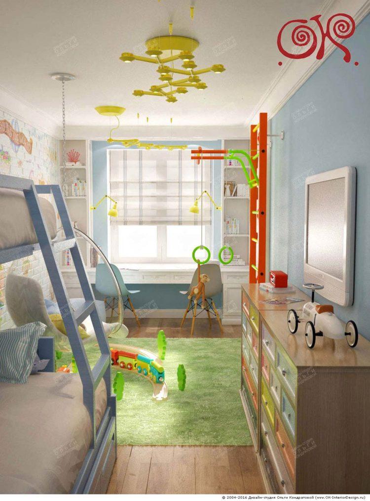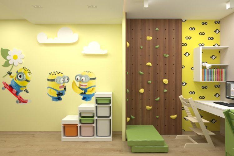El diseño de la habitación infantil para el niño en colores brillantes es una solución universal. El diseño ligero de las paredes le permite seleccionar cualquier mueble para ellas y ajustar el espacio según las diferentes edades del niño.