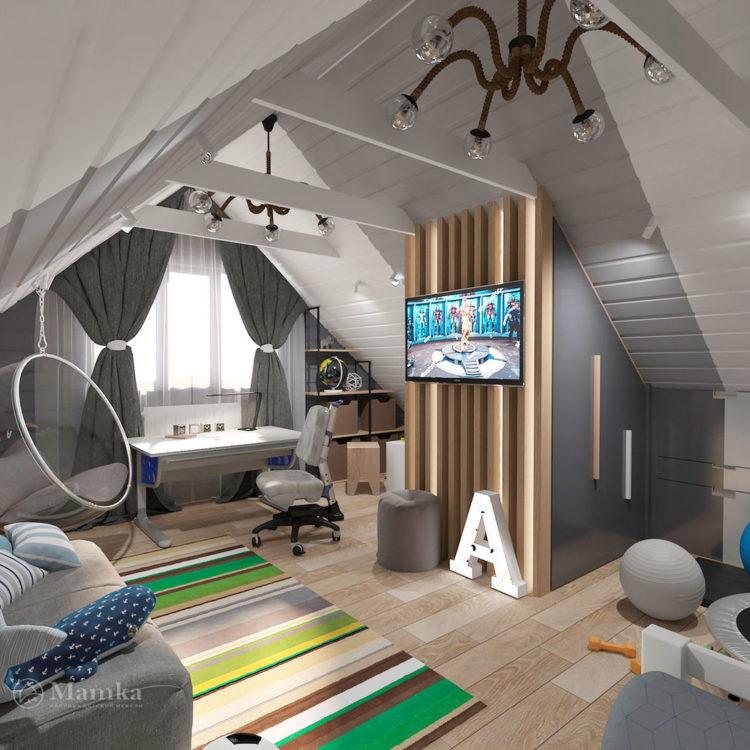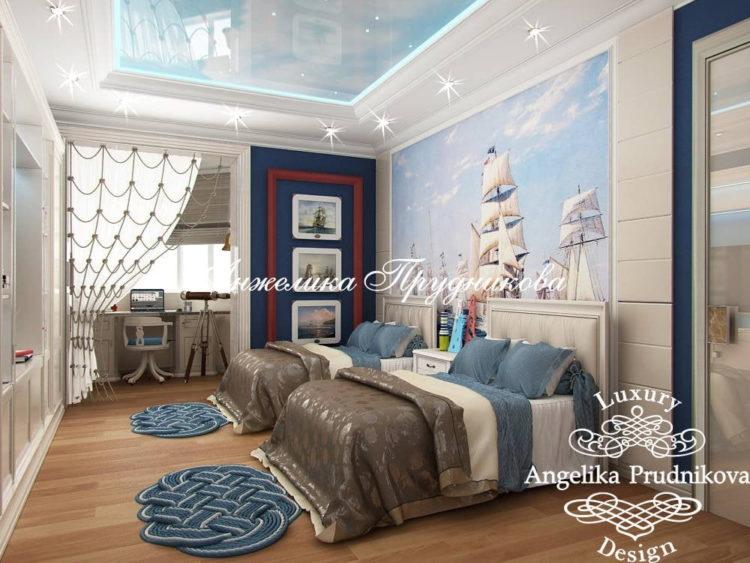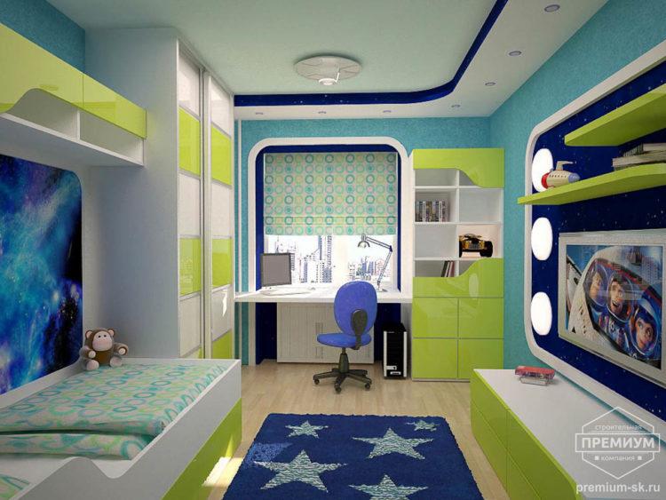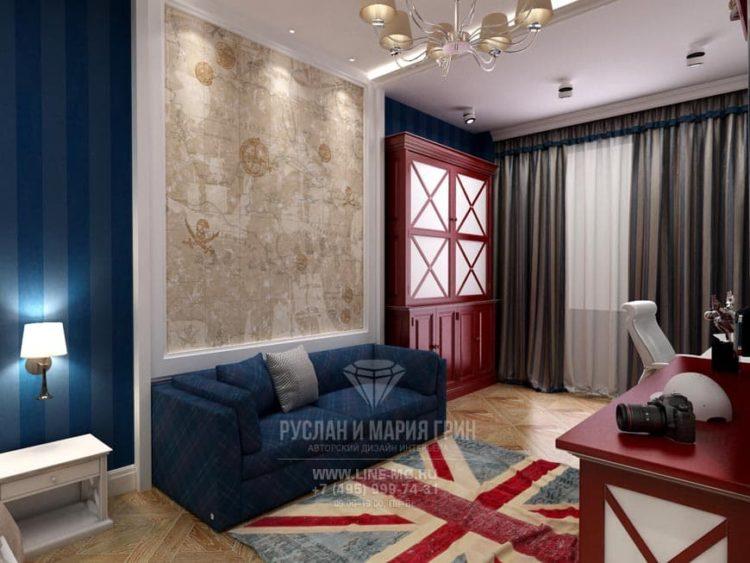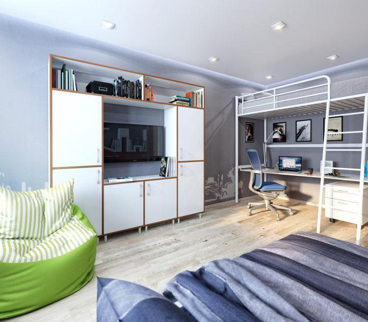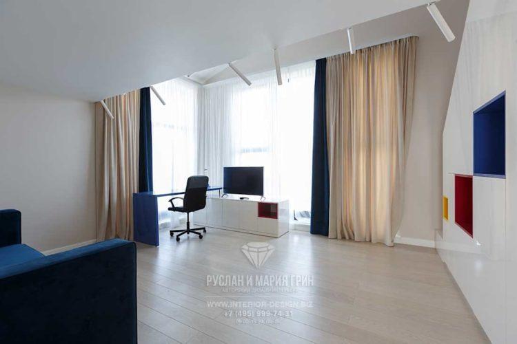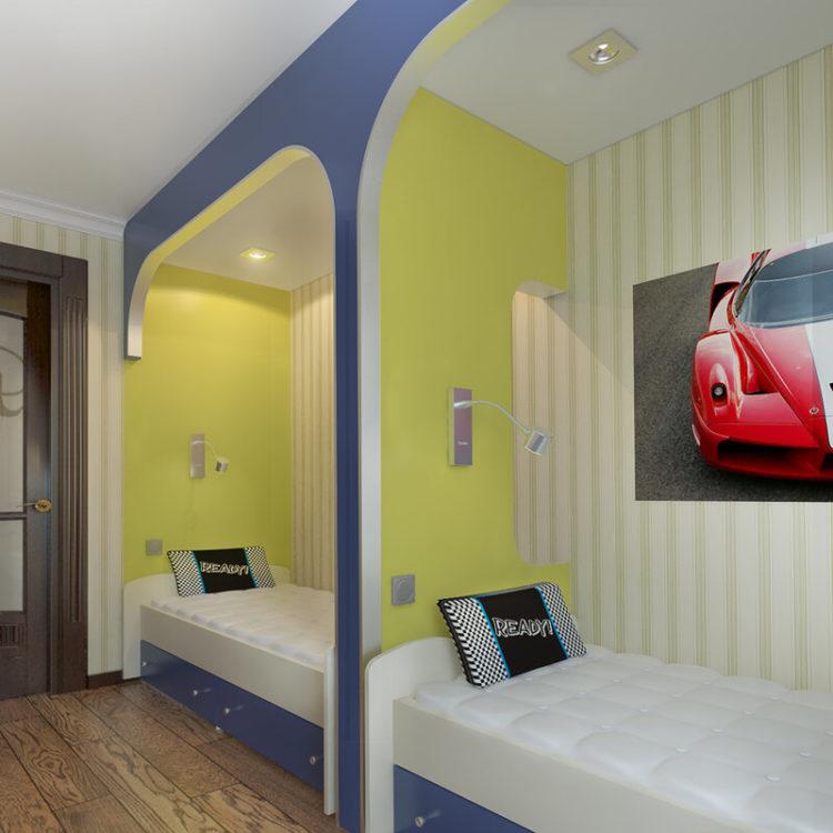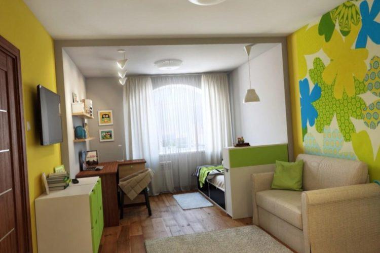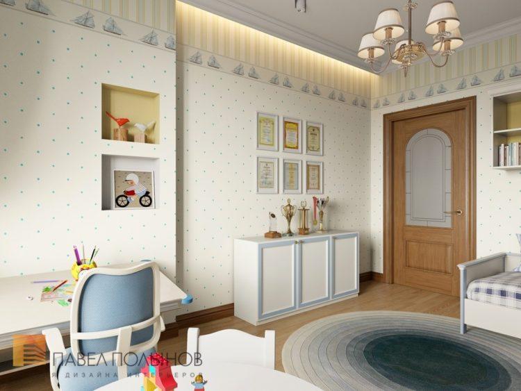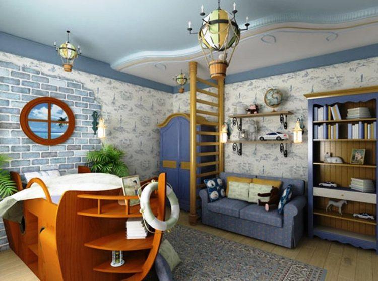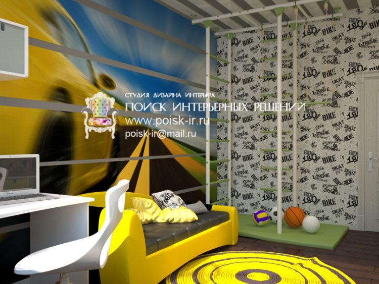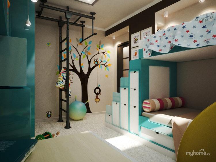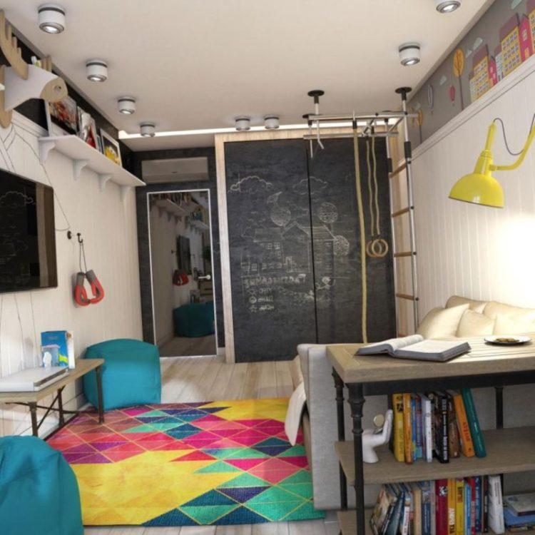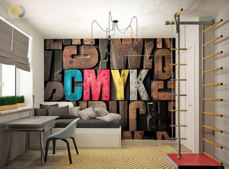 El diseño de la habitación infantil para el niño en colores brillantes es una solución universal. El diseño ligero de las paredes le permite seleccionar cualquier mueble para ellas y ajustar el espacio según las diferentes edades del niño.
