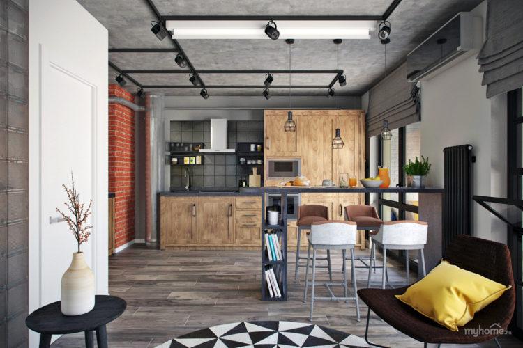 Se recomienda elegir muebles marrones de madera natural, que encajen bien en el interior en el estilo loft.