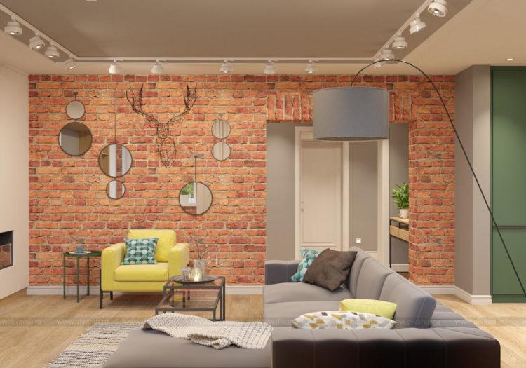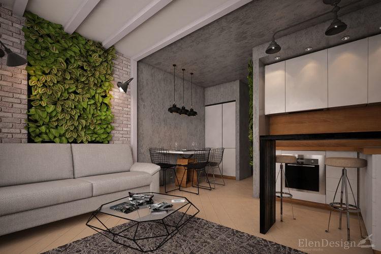 Para el apartamento en el estilo loft no se veía tan gris y sombrío, se permiten ligeros acentos brillantes. A continuación puede ver el diseño de estilo loft con elementos decorativos verdes.