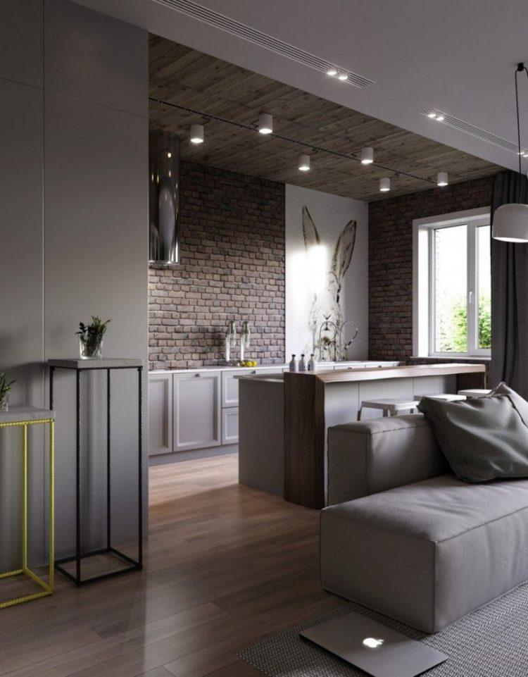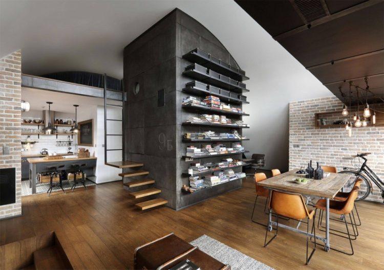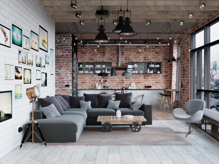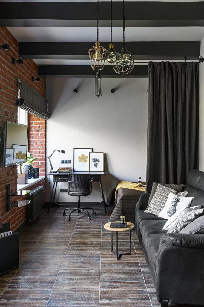 El interior oscuro del desván se puede combinar con otros colores. Por ejemplo, puede hacer una pared de ladrillo oscuro y dejar la otra de color blanco puro, y luego la habitación de estilo loft no se verá oscura.