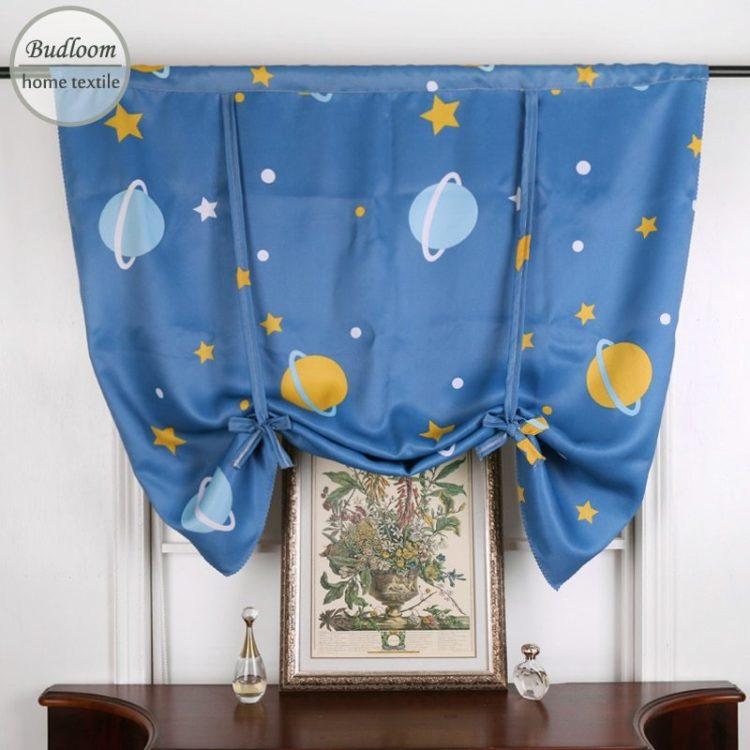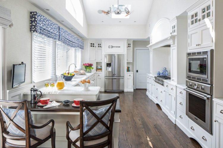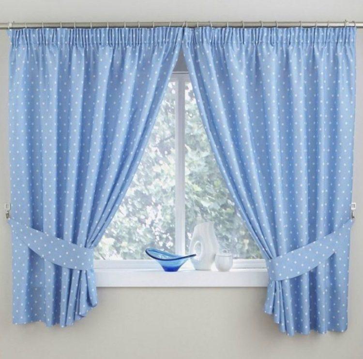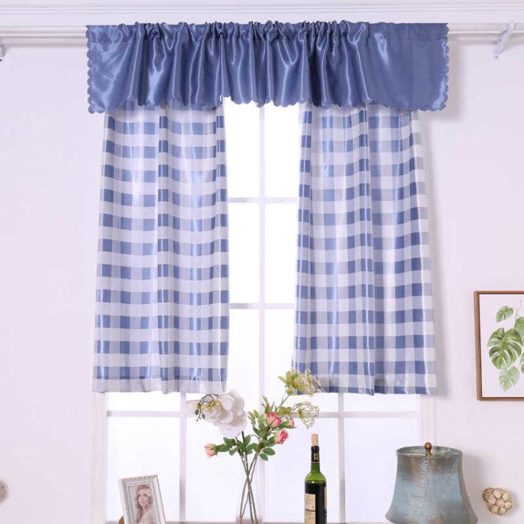 El esquema de color azul de las cortinas de la cocina en un lado (ver foto a continuación) agrega un estilo marino al interior.Cualquier cortina azul de las cortinas de la cocina se verá bien si las ventanas de la cocina miran hacia el sur.