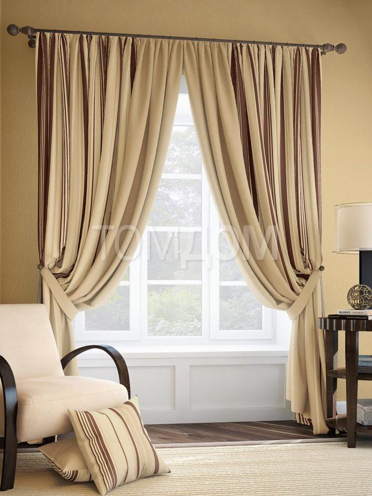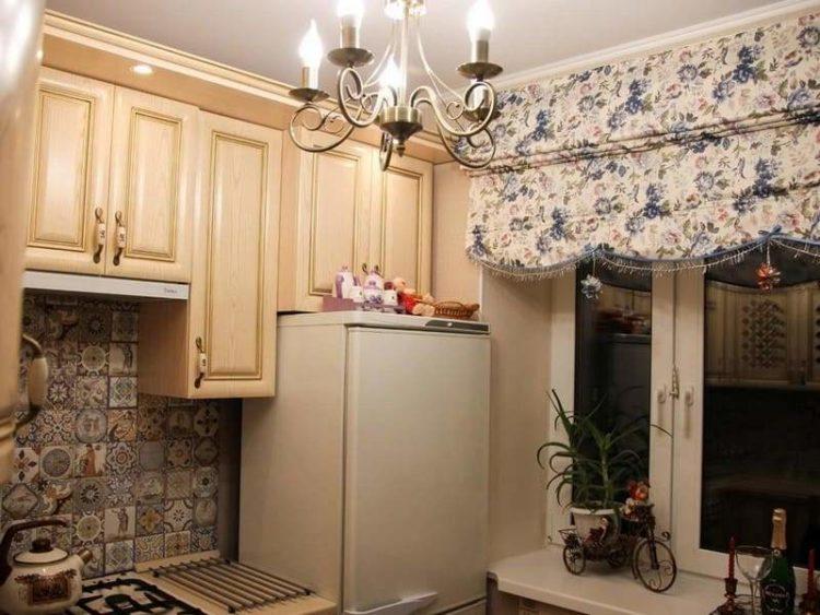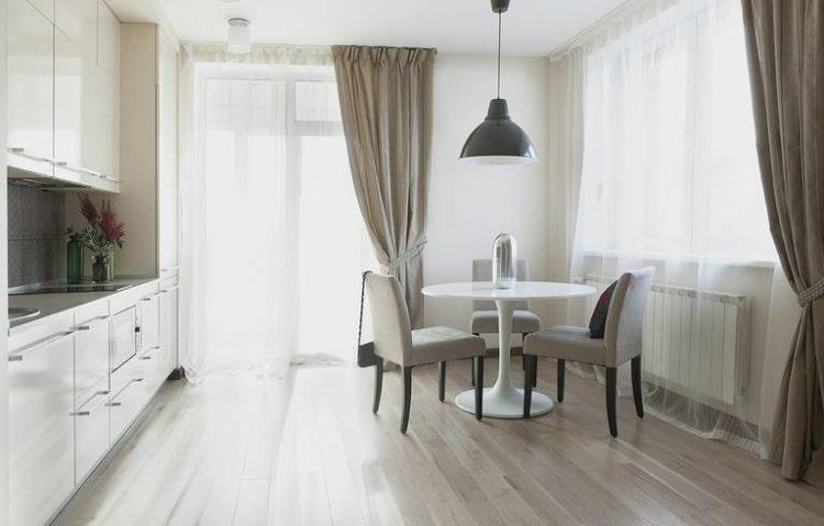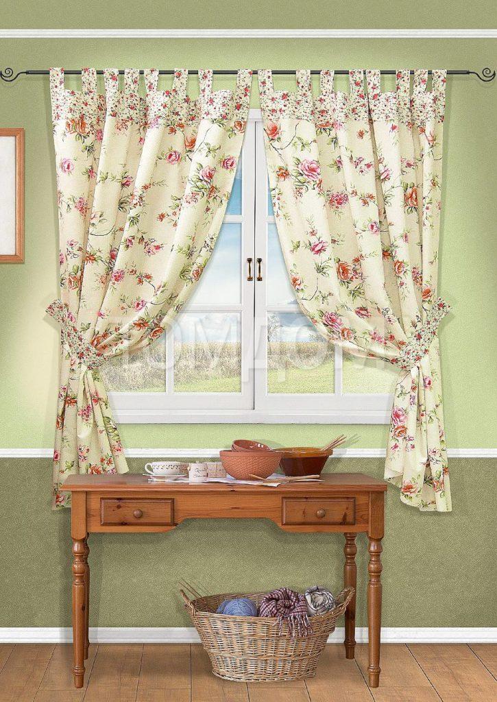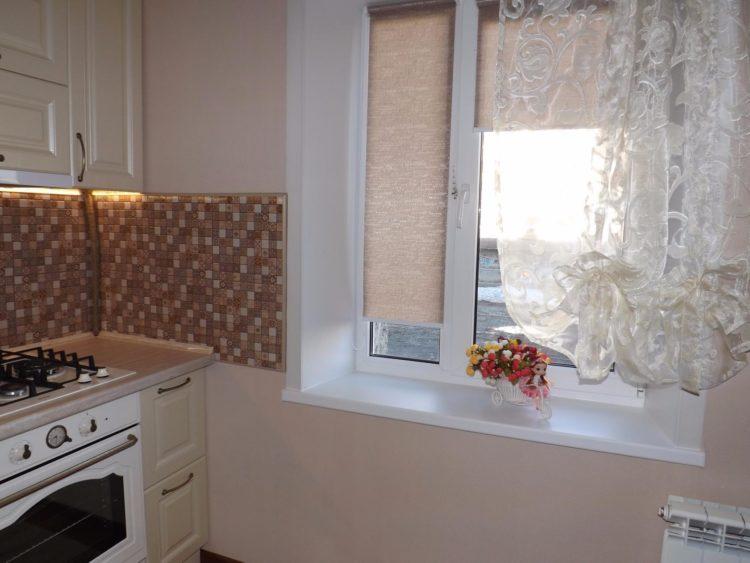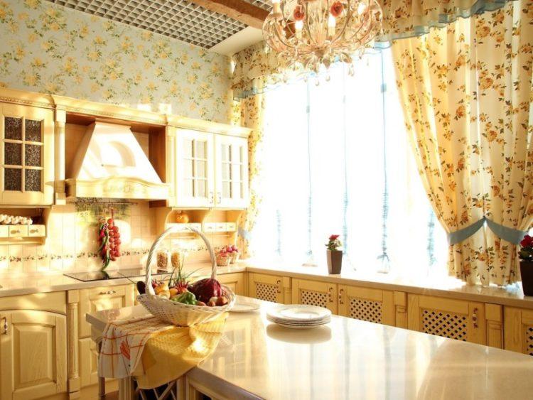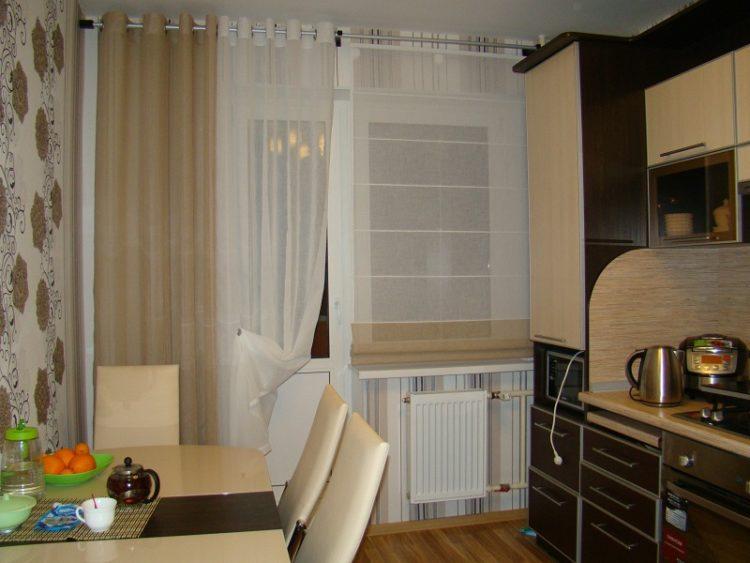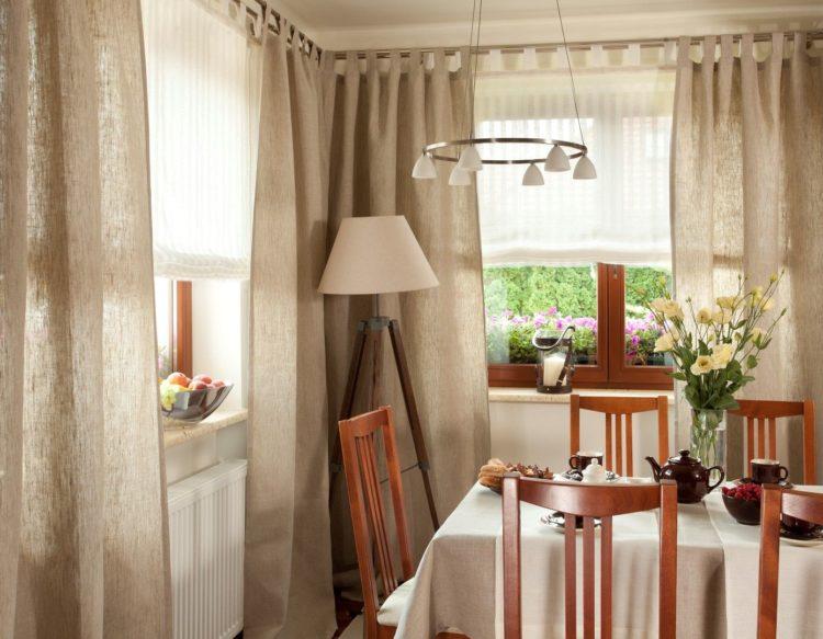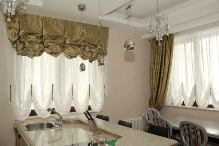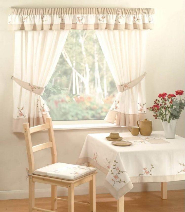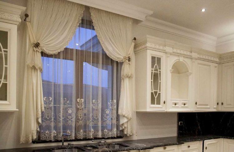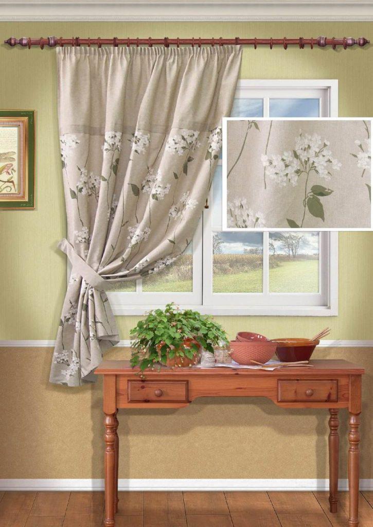 En color beige, las cortinas de la cocina en un lado siempre se ven elegantes y hermosas. Este esquema de color se verá bien en una cocina grande o pequeña, hecha en un estilo clásico.