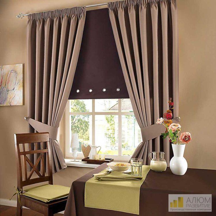 Tal esquema de color, especialmente en colores oscuros, debe elegirse con cuidado. Las cortinas marrones de la cocina al alféizar de la ventana ocultan bien la habitación de la luz solar, mientras que puede oscurecer la habitación.