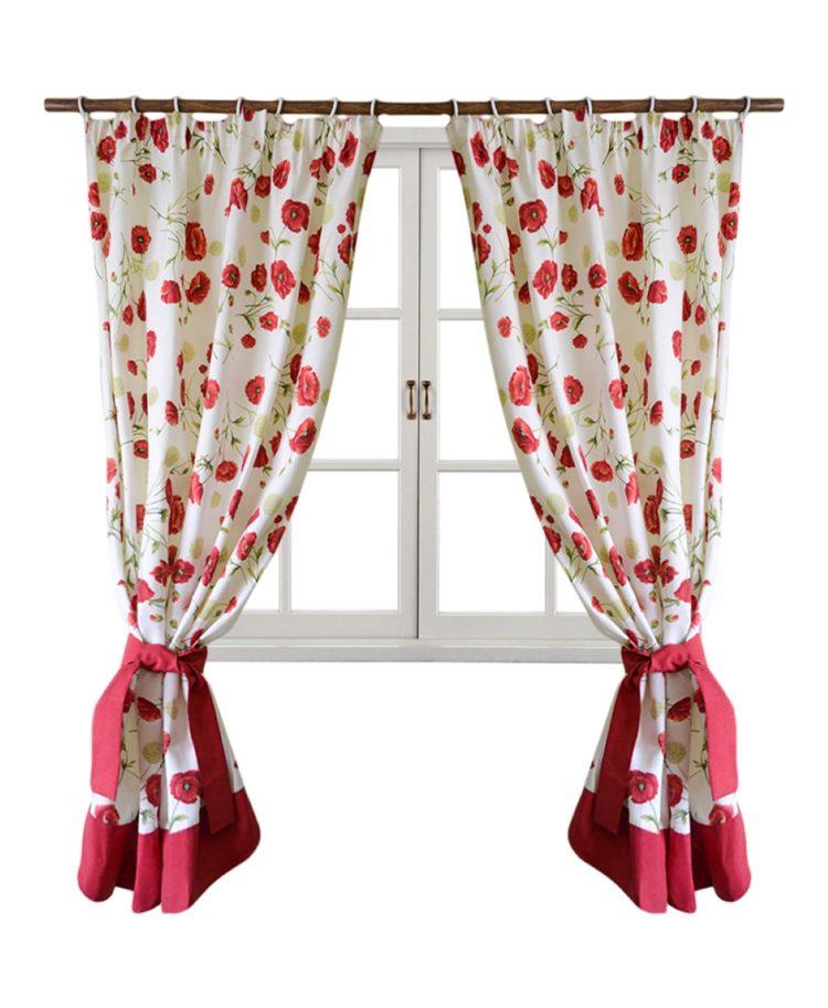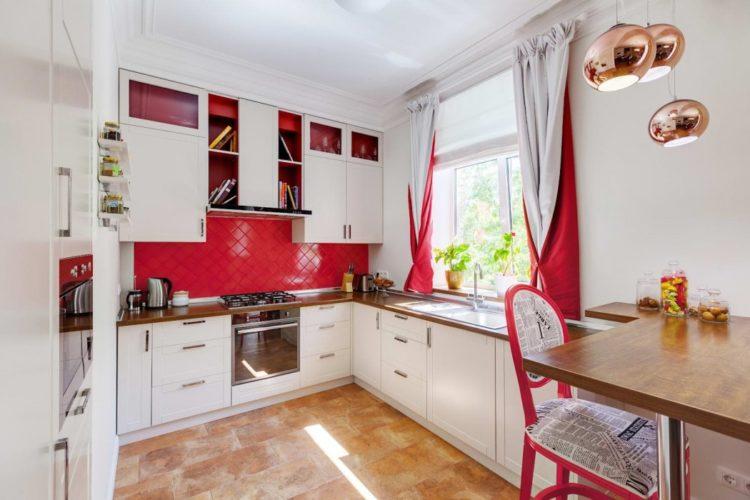 En rojo, el diseño de cortinas cortas para la cocina, cuyas fotos se presentan a continuación, siempre se ve original. Pero vale la pena considerar que algunos tonos de rojo son demasiado pegadizos y pueden verse insípidos en la cocina.