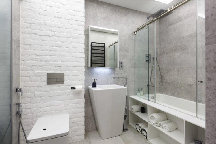 El baño blanco espacioso y elegante siempre se verá elegante en cualquier interior. Con la selección correcta de tonos de las inserciones, es posible ajustar visualmente el espacio al tamaño deseado.