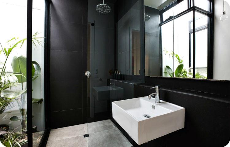 Probablemente el color más utilizado en el interior del baño es el negro. Las fotos de reuniones de hermosas habitaciones en negro puro probablemente no sean tan difíciles, pero es importante comprender que las sombras oscuras son adecuadas solo para habitaciones grandes. Si tiene un baño pequeño, pero desea usar negro, resalte los pequeños elementos de decoración en este color.