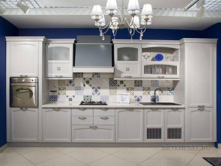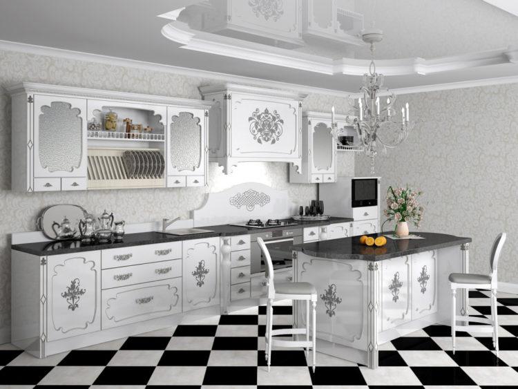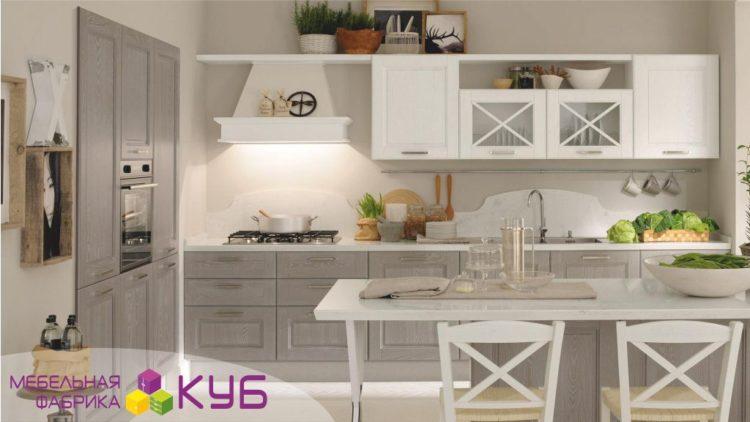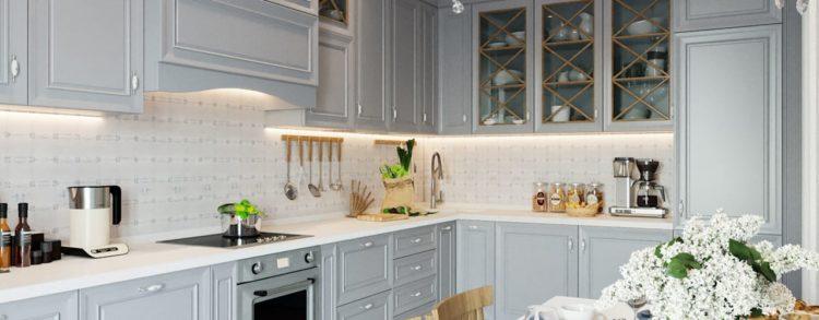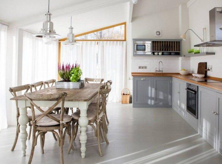 El gris dominante en combinación con el blanco aumenta visualmente el espacio en la cocina. Muchas amas de casa solo sueñan con cocinar, poner la mesa en una cocina blanca como la nieve, y la presencia de muebles grises en colores cálidos y fríos complementa una cierta sofisticación moderna en toda la atmósfera. Diseño interior de la cocina provenzal en la foto: