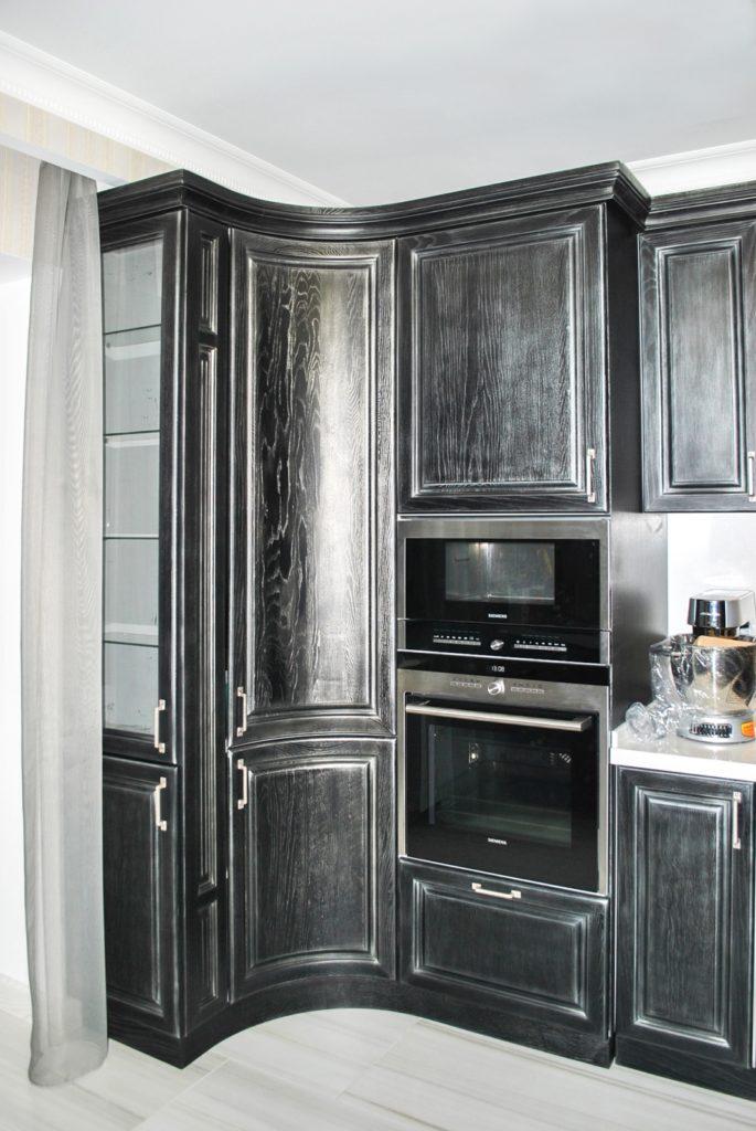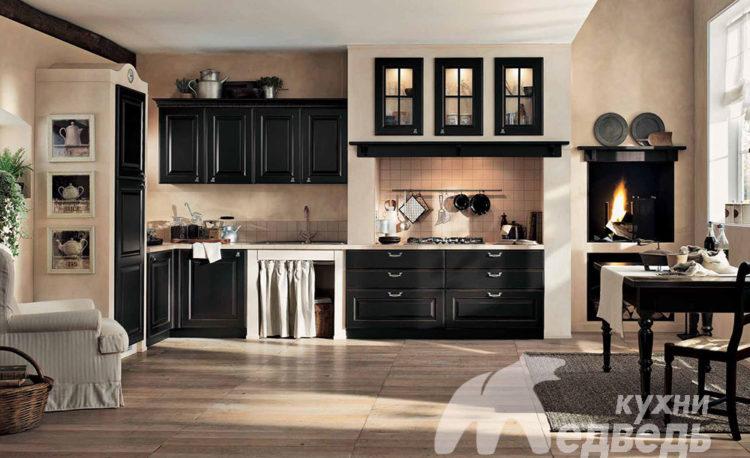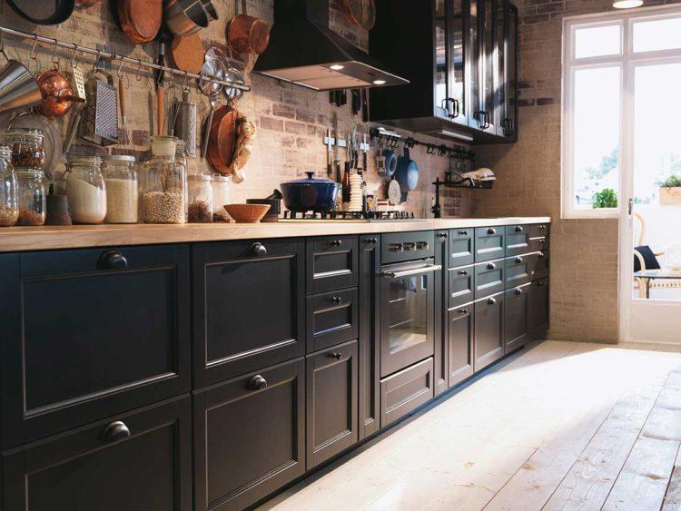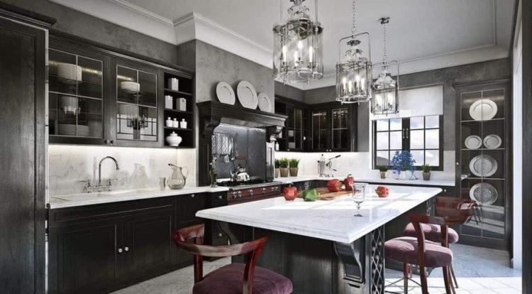 El interior moderno de una cocina de estilo provenzal no implica el uso del negro como color principal. Sin embargo, los diseñadores experimentados encuentran ideas interesantes y audaces. Califica el estilo de cocina provenzal en negro en la foto: