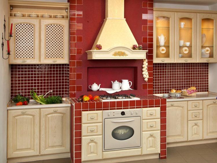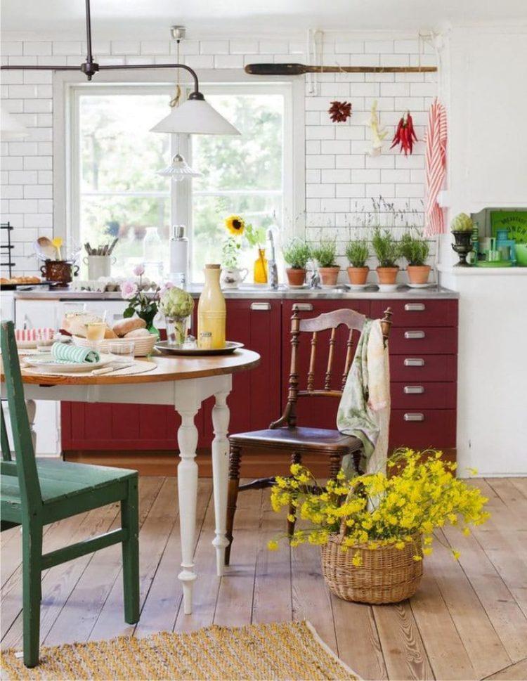 Organizar un diseño interior de cocina al estilo provenzal en rojo es una solución audaz y creativa que merece la atención de personas activas y decididas. Una cocina tan festiva nunca se verá aburrida, deleitando a los propietarios con un buen humor y una actitud positiva. Además, los azulejos rojos en el estilo provenzal para la cocina serán una excelente solución. Opciones de fotos de cocina provenzal en rojo: