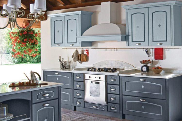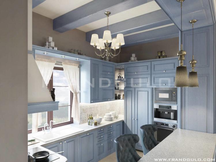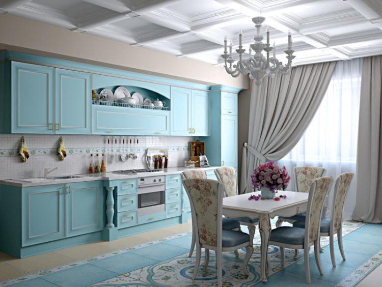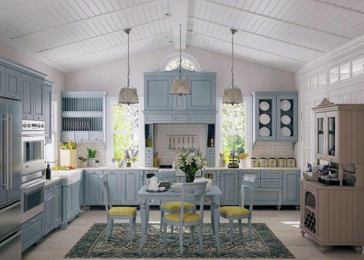 El diseño de la cocina en estilo provenzal en tonos azules no se puede ver con tanta frecuencia como en colores fríos más claros y suaves. Sin embargo, este color, tan similar al color del mar, es bastante apropiado en el diseño de dicho interior. Es cierto que es mejor no usarlo en cocinas sombreadas y, además, pequeñas, ya que el azul no solo hará que la habitación sea aún más oscura, sino que también la reducirá visualmente. Los diseñadores aconsejan agregar un tono lavanda al diseño de la cocina de este estilo, por ejemplo, para comprar muebles de un color similar o usar papel tapiz en el estilo provenzal para la cocina. Estilo provenzal en el interior de la foto de la cocina:
