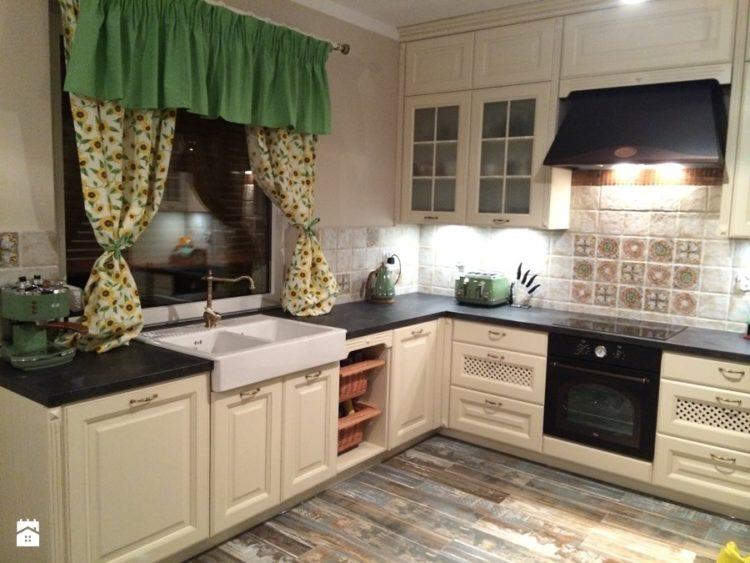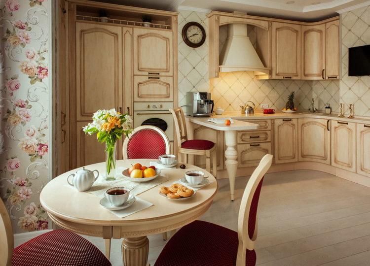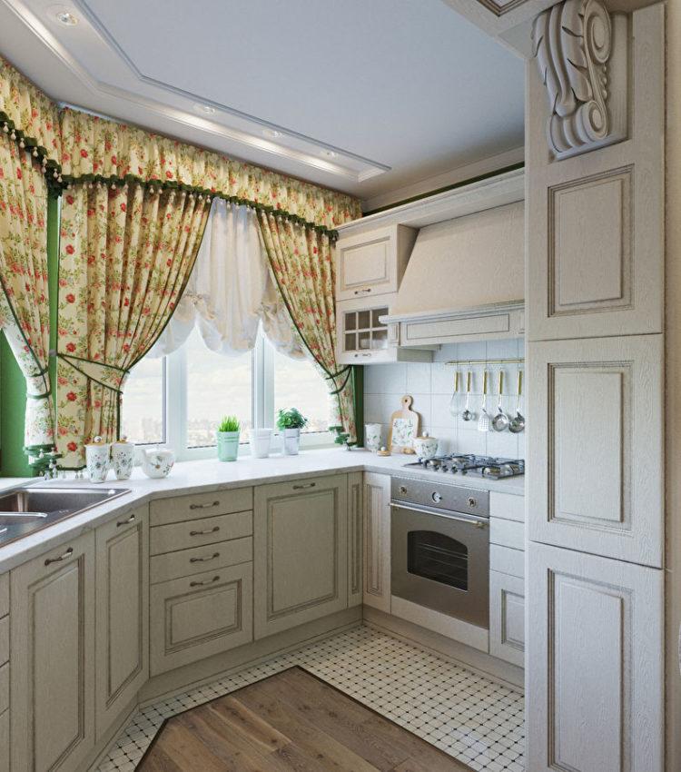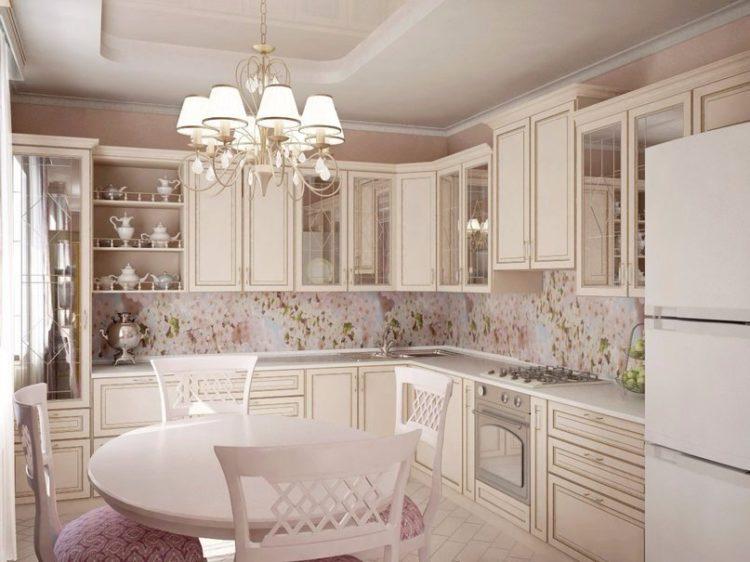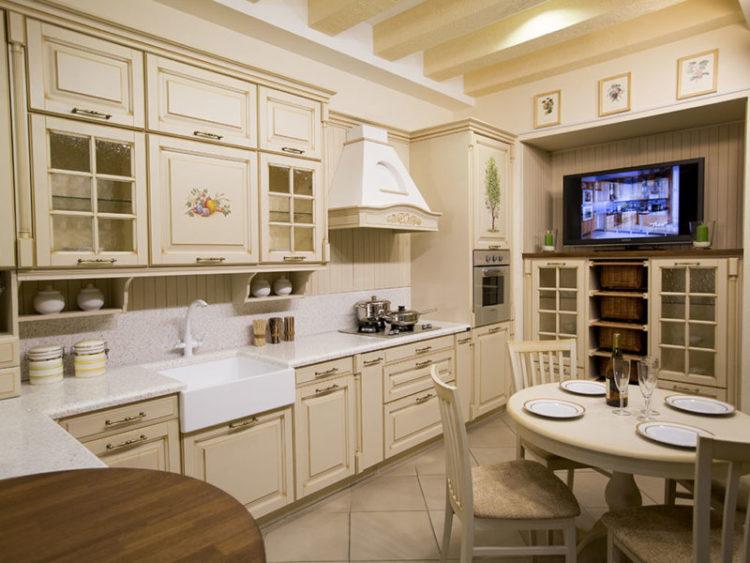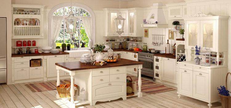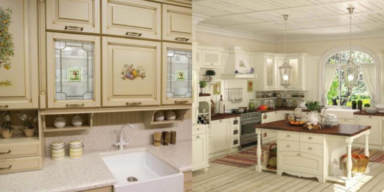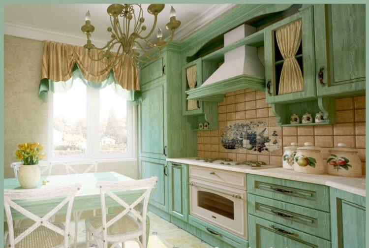 Como regla general, el fondo es delicado color beige, las paredes y el techo están pintados. Sin embargo, a pesar de su ventaja en el entorno, el juego de cocina de Provenza, así como otros artículos y utensilios, también pueden ser de este color.