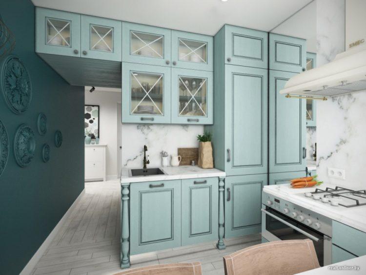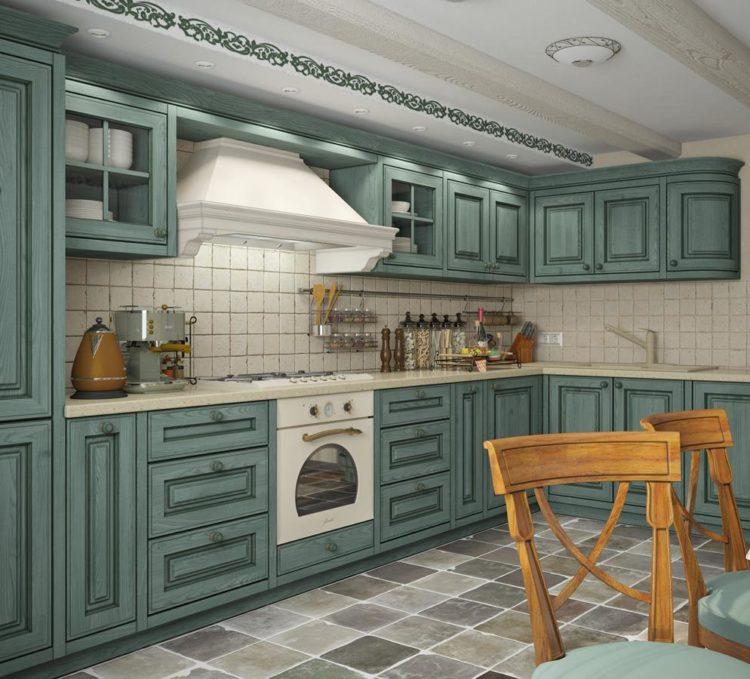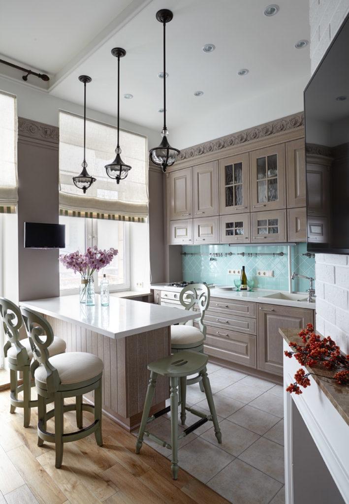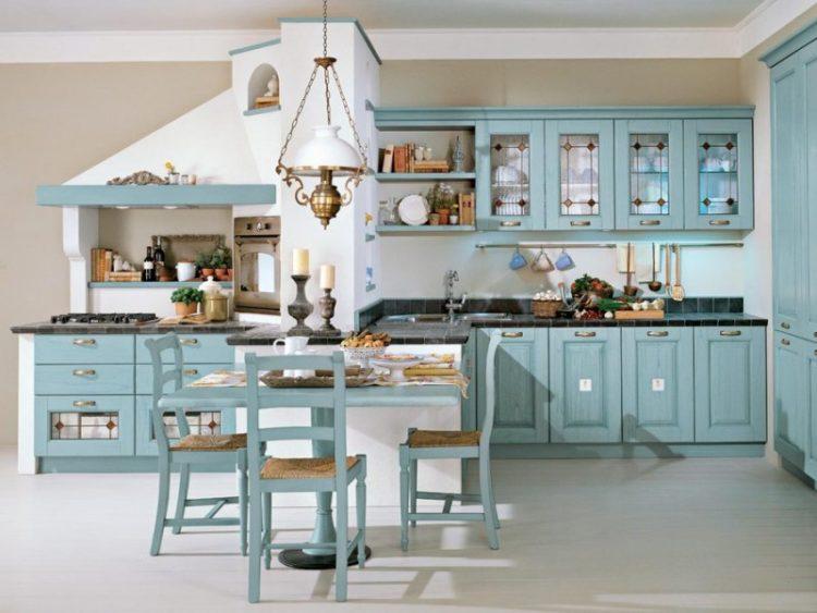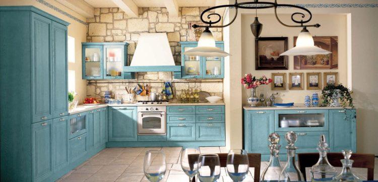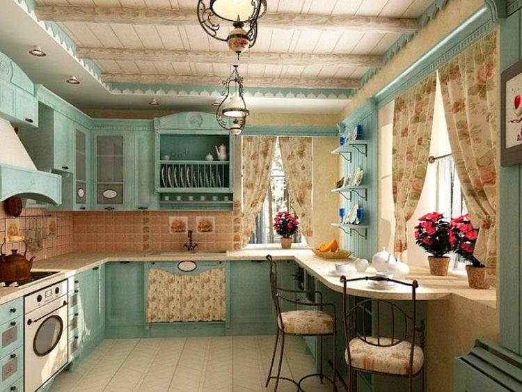 El interior moderno de la cocina de estilo provenzal asume la presencia de colores pastel claros que reflejan con mayor precisión la atmósfera de la vida del pueblo entre la naturaleza pura, así como el sol brillante. Sin embargo, la paleta de colores tiene sus propias reglas de combinación que deben considerarse. Estilo de cocina provenzal en colores brillantes en la foto: