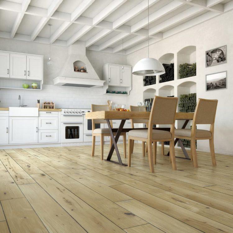 El color blanco en estilo provenzal es como una hoja de papel blanco para el artista (los primeros trazos de pintura son visibles de inmediato en la hoja). Vigas de techo blanqueadas con hacha hachadas, paredes blanqueadas ásperamente enlucidas, piso de piedra blanca. Los acentos del color de las uvas rosadas y la lila lavanda, el azul marino y el azul cielo, el oro girasol y el brillo esmeralda del follaje yacen en blanco. Cocina en estilo provenzal interior de foto blanco: