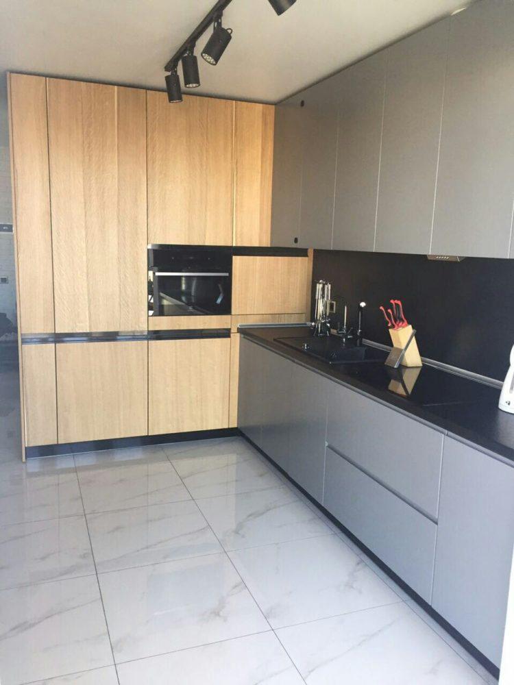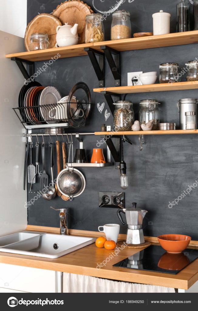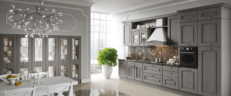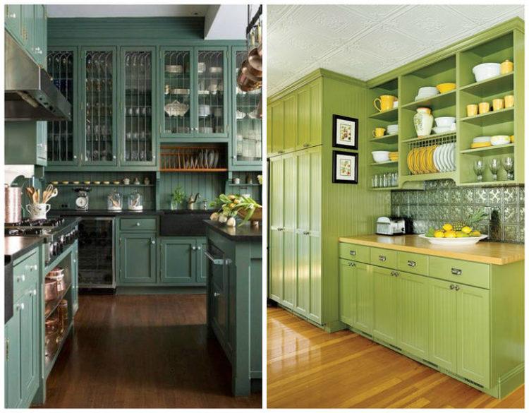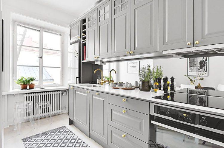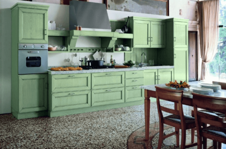 Los muebles de cocina de color gris u oliva también son apropiados en el país. Y aquí también tiene su propio entusiasmo.