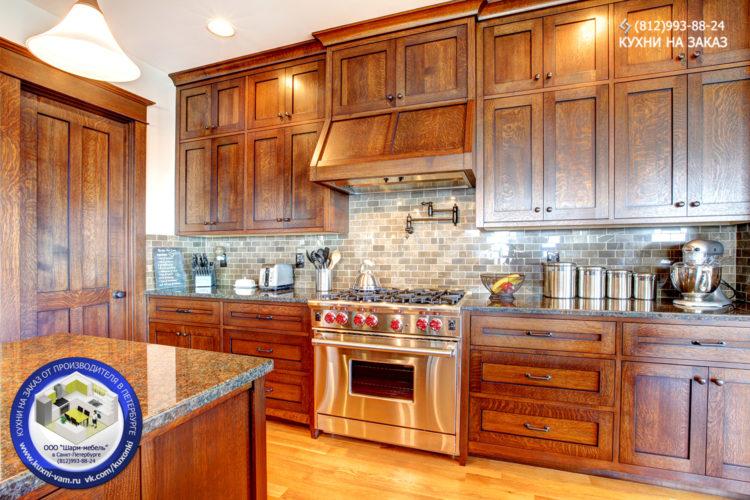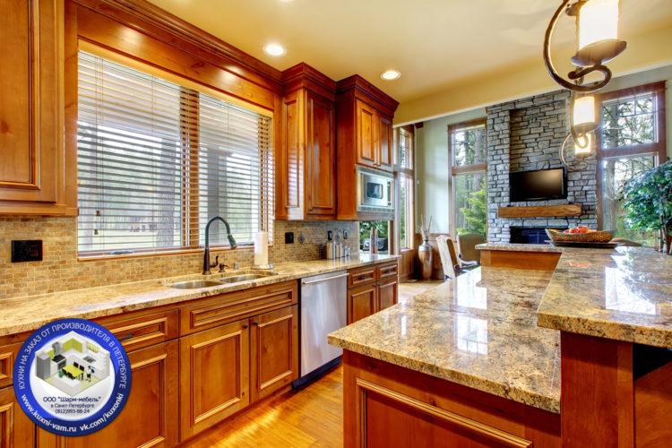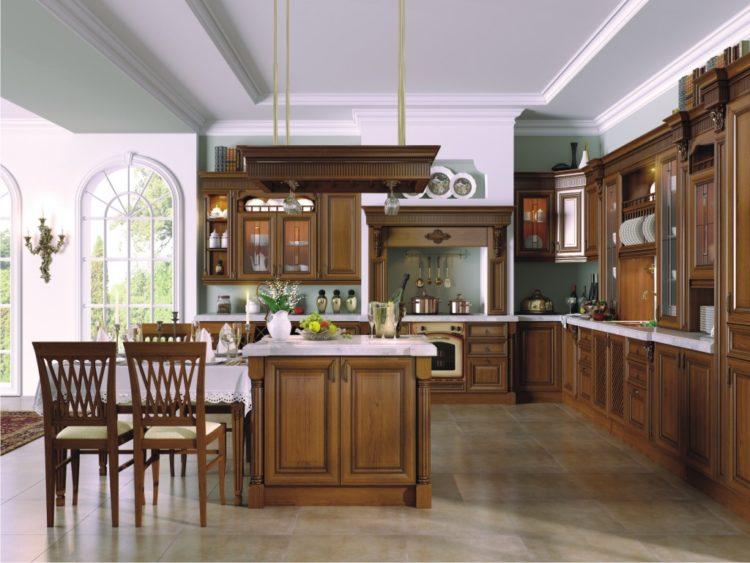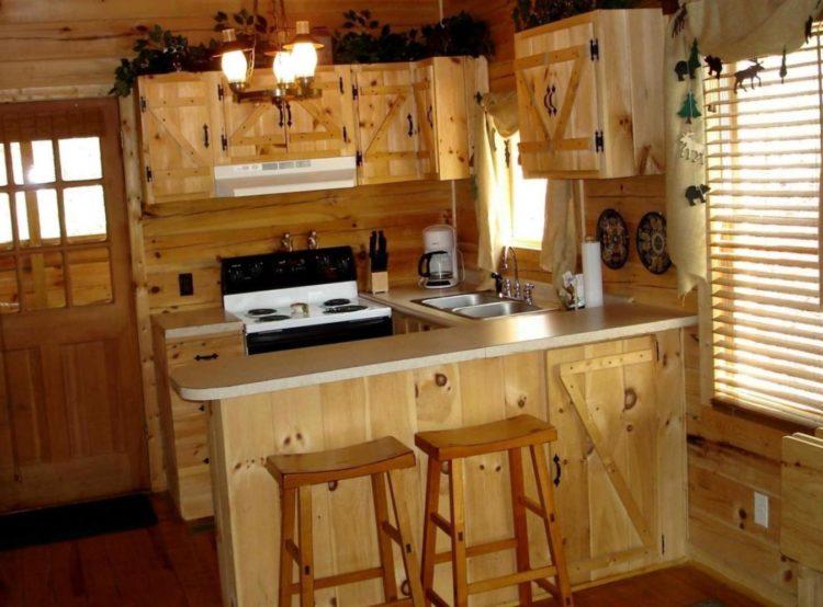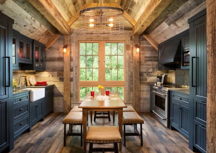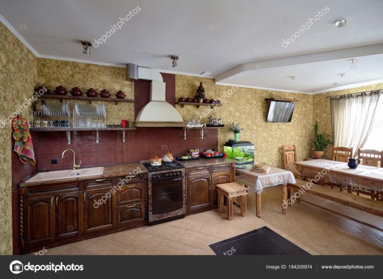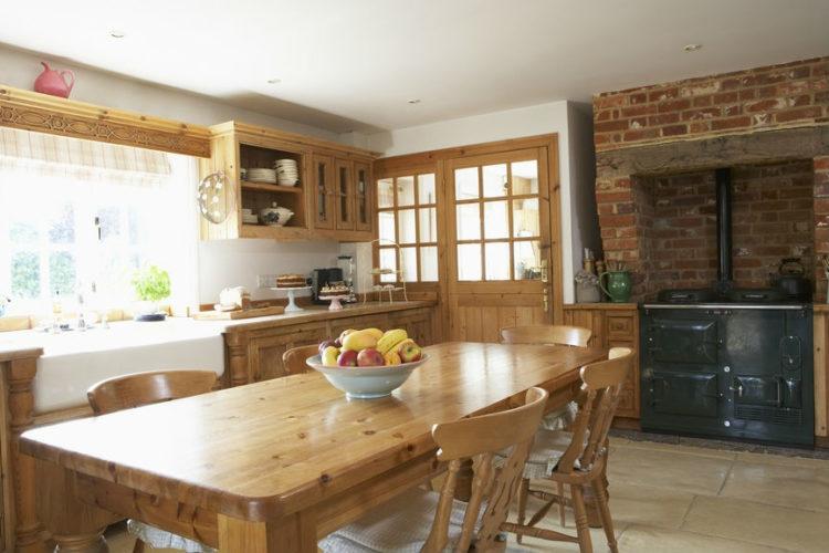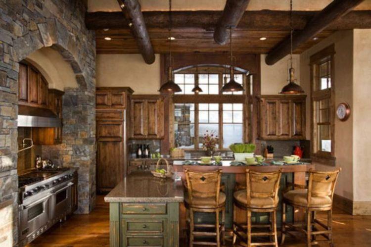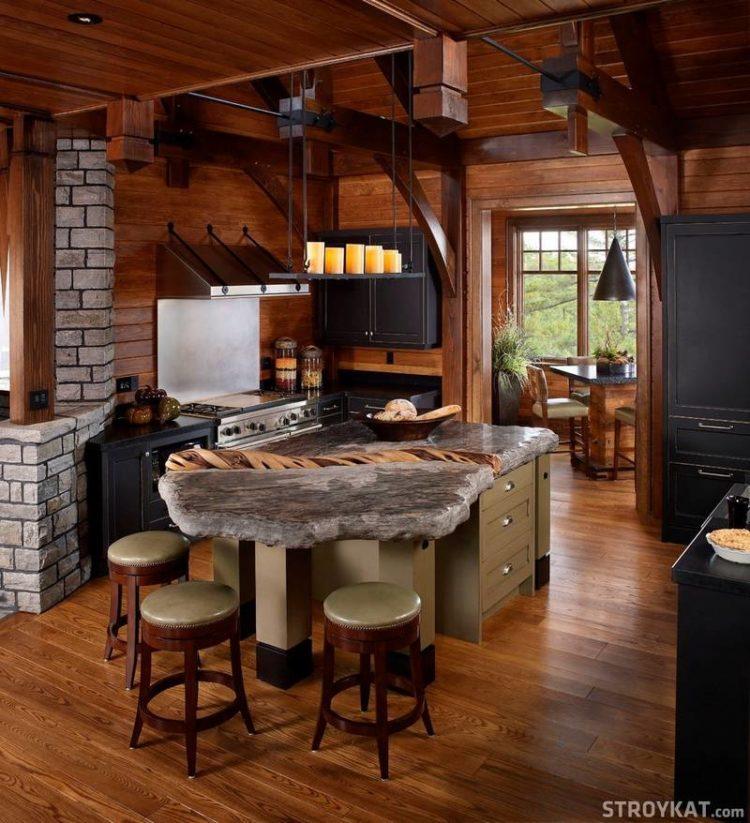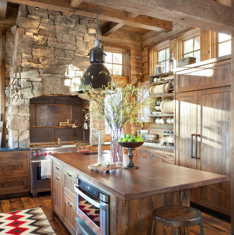 Anteriormente, las casas en el pueblo fueron construidas principalmente a partir de una casa de troncos de madera. Es este material el que define el estilo rústico principal. La cocina en la casa de troncos (diseño de la foto debajo del artículo) siempre estaba equipada con una estufa. En él, no solo cocinaba, sino que también dormía en sus bordes.Por supuesto, hoy raramente construyen hornos con tales camas para dormir. Pero la estufa en sí misma sigue siendo un elemento indispensable en el interior de madera de la cocina.