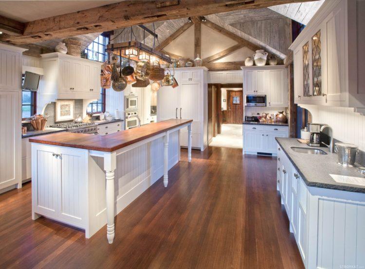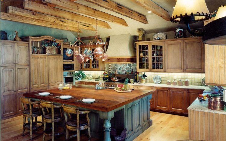 Si coloca muebles rústicos en la cocina, es importante tener un ligero desgaste, que recuerde un toque de antigüedad. Además, todas las asperezas y golpes agregarán una atmósfera de confort al interior de la cocina en un estilo rústico. Puede diseñar una cocina en un estilo rústico combinando vigas de madera y cal, especialmente si no es la cocina del apartamento, sino la cocina del país en una casa de madera (puede usar la foto de la casa en el país en sus proyectos de diseño).