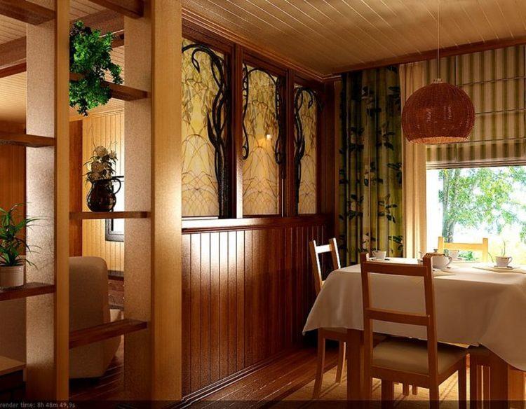 El diseño de la cocina con la estufa puede estar repleto de patrones brillantes con gallos, sol, viburnum. El interior de la cocina en una casa de madera implica no solo el olor a pasteles, sino también el olor a manzanas y todo tipo de hierbas. Por lo tanto, la decoración en una casa privada de troncos son cestas de frutas, manojos de hierbas secas, etc. La cocina en el pueblo se puede crear con sus propias manos, lo que le dará un confort especial.